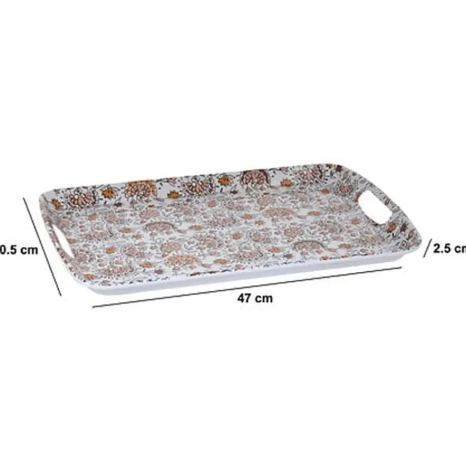 Design serveer dienblad met opstaande rand van 2 cm voor glazen en kopjes. Materiaal: melamine. Print: Flowers. Afmetingen: 47 x 30 x 2 cm. Gebruik het dienblad voor het serveren van koffie, thee, gebakjes, ontbijt, noem maar op. Deze karaktervolle, maar vooral ook handige ruime serveertray is overal voor te gebruiken. Kleur: wit als basis kleur.