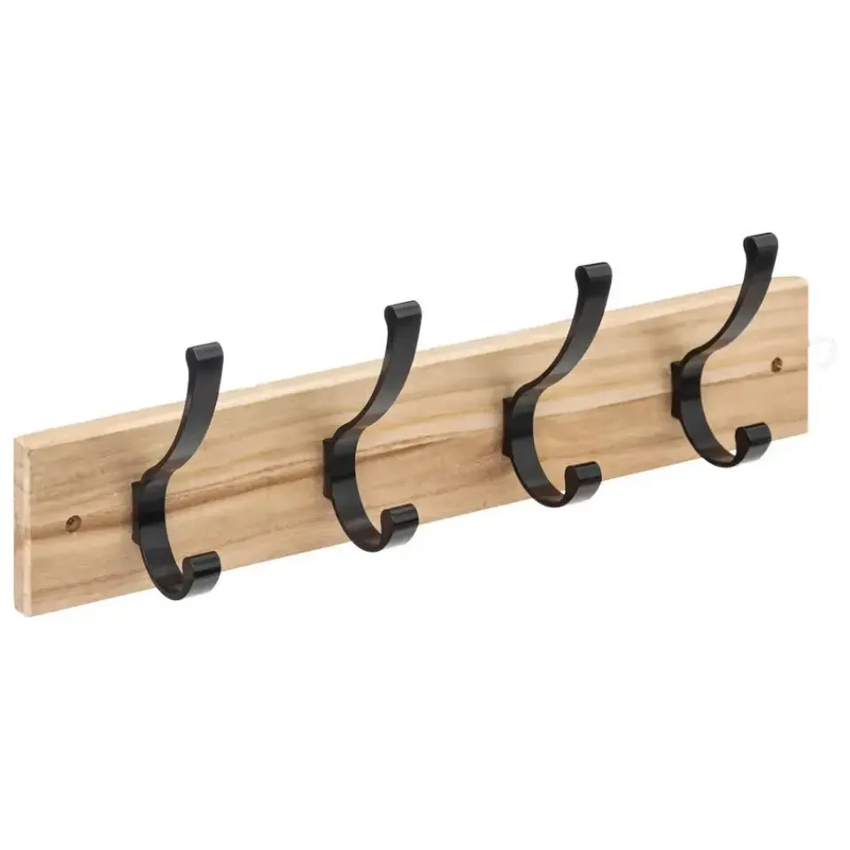 Kapstok rek voor aan de muur/wand in de kleuren lichtbruin/zwart. Ideaal om je jassen en hoofddeksels aan op te hangen, dankzij de 4x stuks ophanghaken/knoppen is er genoeg ruimte om diverse stukken op te hangen. Afmeting: 42 x 8 cm. Materiaal: MDF/metaal. Wandkapstokken. Merk: 5Five. Home storage artikelen.