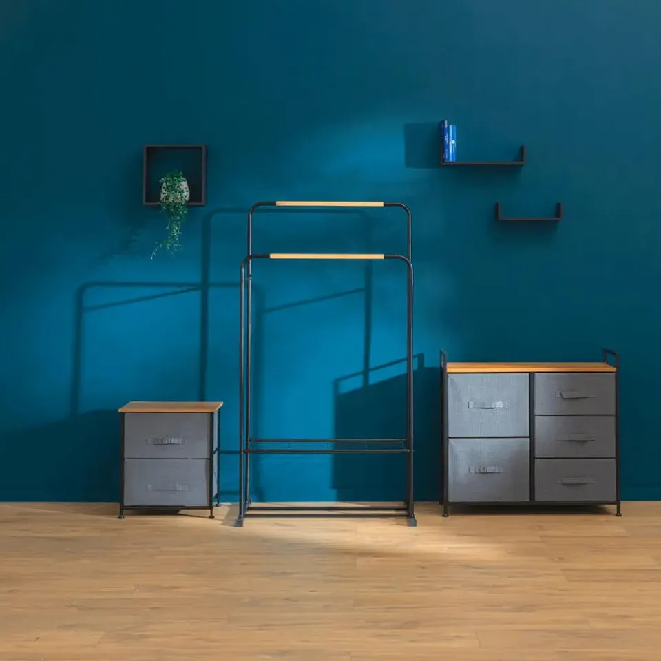 Badkamerkastje / opbergkastje / nachtkastje / mandjes kastje. Een handig bijzet kastje met 2x opberg manden gemaakt van non-woven kunststof in de kleur donkergrijs voor in badkamer, hal of slaapkamer. Ideaal om washandjes, tandpasta, zeepjes, medicijnen, speelgoed of cosmetica in op te bergen. Afmeting: ca. 45 x 30 x 51 cm. Materiaal: metaal/mdf hout/polyester. De mandjes zijn in 1 formaat. Merk: 5Five. Zelf monteren.