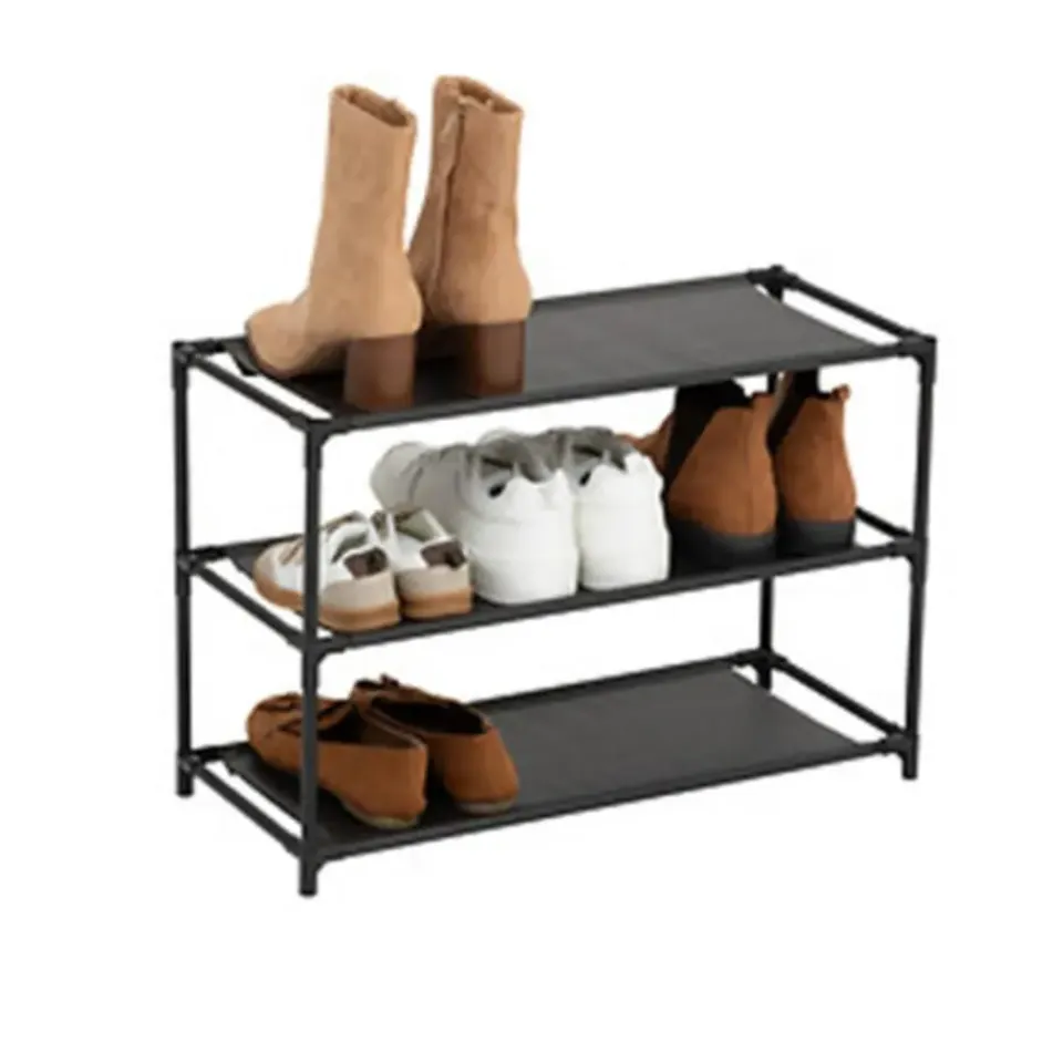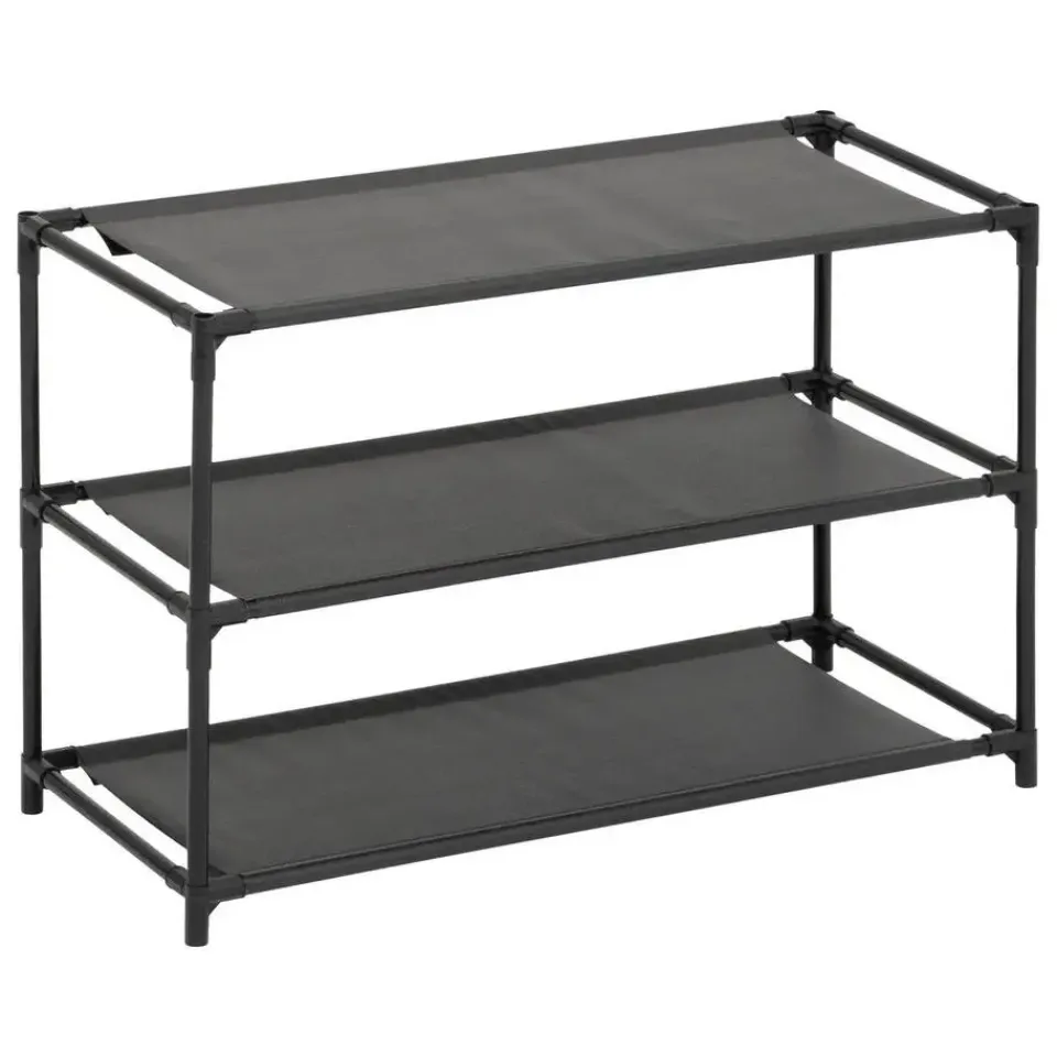 Schoenenrek Intissa 3-laags rekje met ruimte voor ongeveer 9 paar schoenen. Gemakkelijk in elkaar te zetten, wordt geleverd inclusief gebruiksaanwijzing. Formaat: ca. 57 x 25 x 39 cm. Materiaal: metaal met kunststof. Netjes je schoenen stapelen met dit voordelige rekje. In de kleur zwart.