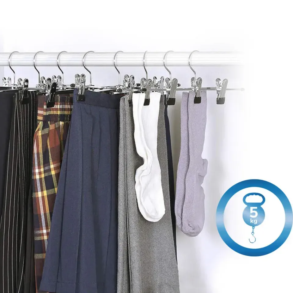 De broekhangers zijn verstelbaar in de breedte en dus geschikt voor het ophangen van broeken en rokken maar ook kleine zaken zoals handdoeken, sjaals, handschoenen, sokken, enz. De kleerhangers met knijpers zijn klein en nemen dus weinig ruimte in beslag.