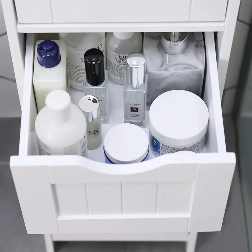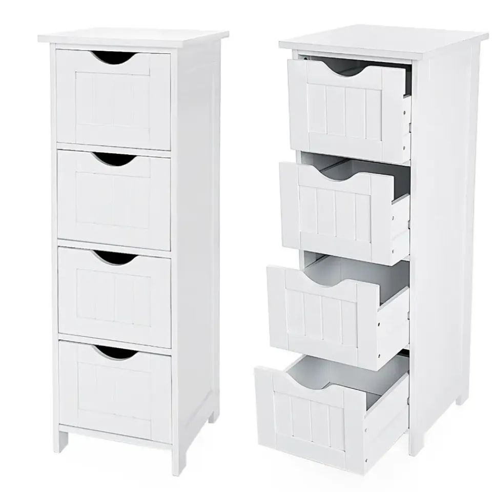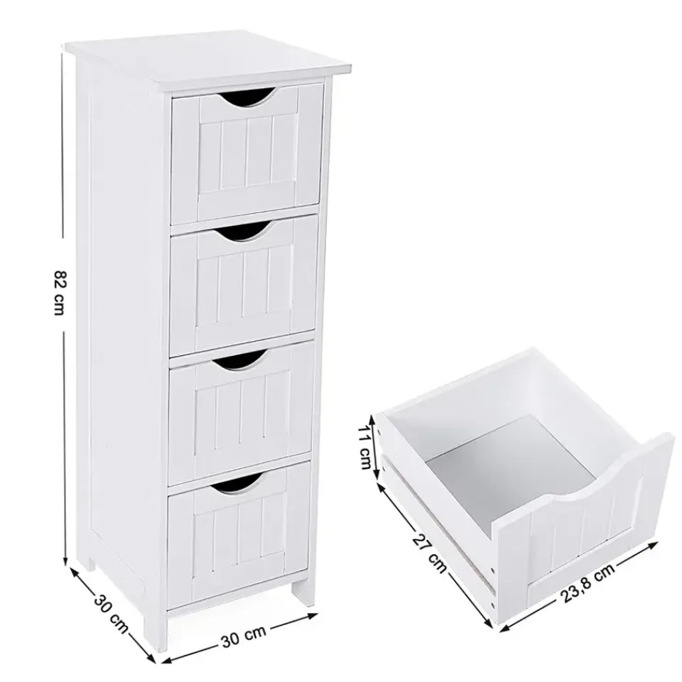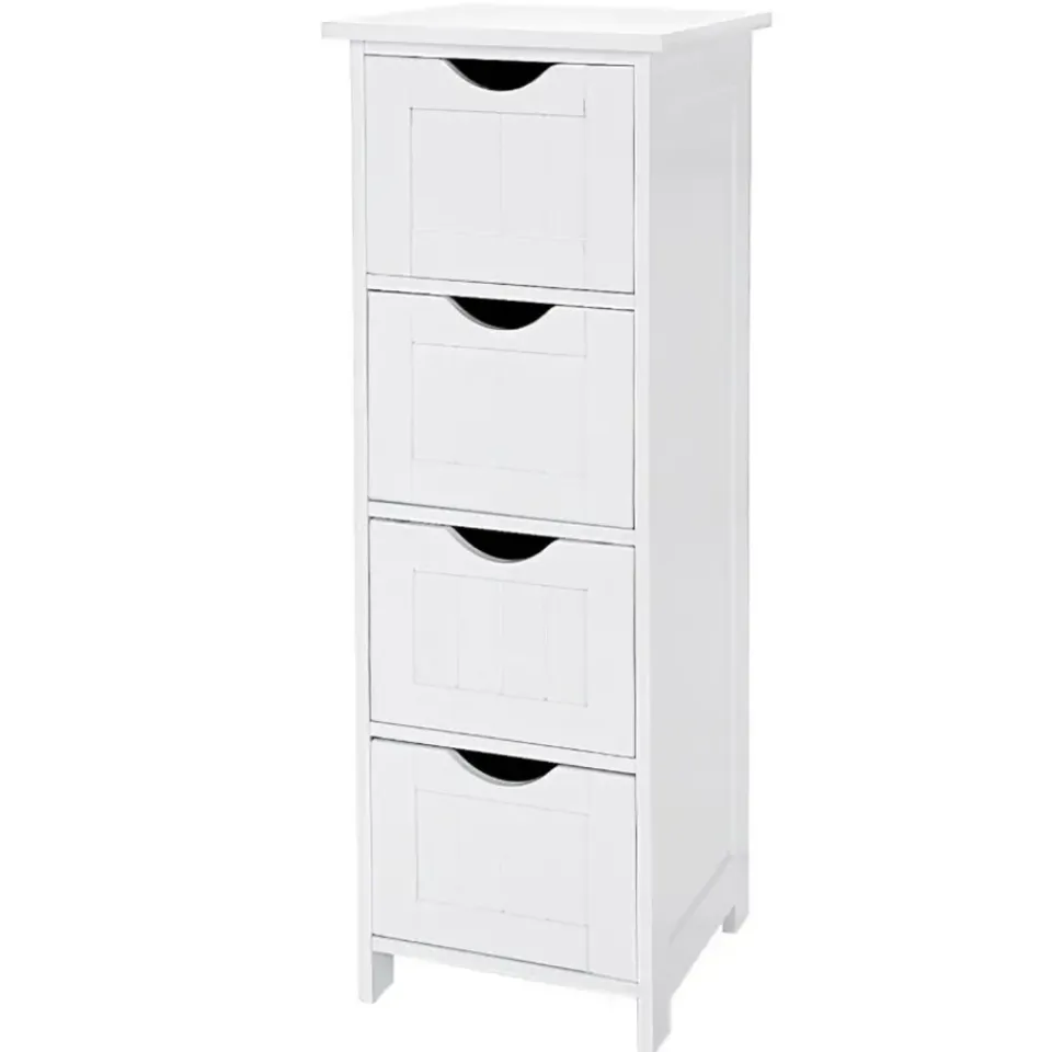 Deze zeer praktische ladekast zal perfect een plaatsje vinden in jouw badkamer. Met vier ruime vakken is er alvast aan opbergruimte zeker geen gebrek. Ook het bovenblad kan je praktisch benutten door er decoratie op te zetten. En dat is nog niet alles! Door een speciaal ontwerp kunnen de opberglades er bij het openen niet uitvallen. Super handig, niet? Het glanzende oppervlak is te danken aan een vernislaag die het meubel bovendien ook vochtbestendig maakt.
