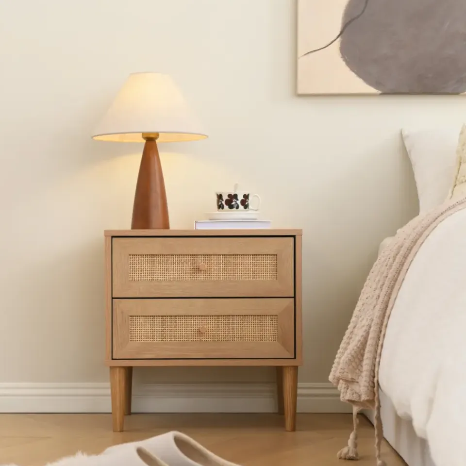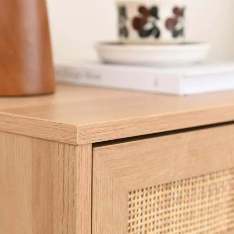 Breng stijl en functionaliteit in je slaapkamer met dit prachtige nachtkastje, gemaakt van stevig MDF en afgewerkt met een charmant rotan accent. De natuurlijke kleur en textuur van het rotan brengen een warme en gezellige sfeer in je kamer.