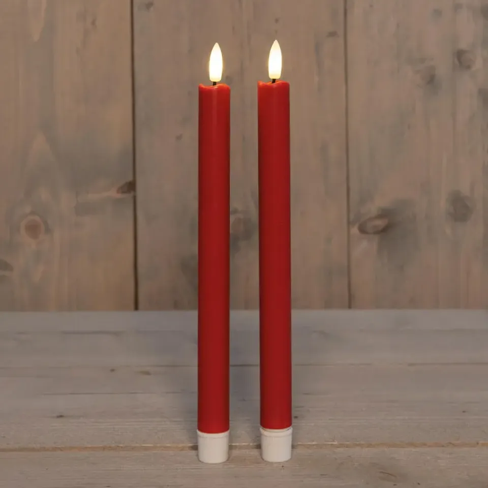LED dinerkaarsen 2x stuks in de kleur rood. De kaarsen zijn ongeveer 25 cm lang en geven een warm wit licht. Deze kaarsen zijn ideaal als decoratie voor elke speciale gelegenheid. Ze geven een warm, rustgevend licht en zijn veilig in gebruik. Deze LED dinerkaarsen zijn perfect om uw tafel een aangename sfeer te geven. Met 3D vlam. Voeding per kaars: 2 AAA batterijen (niet inbegrepen). De handige timerfunctie maakt het gemakkelijk om de kaars automatisch in- en uit te schakelen.