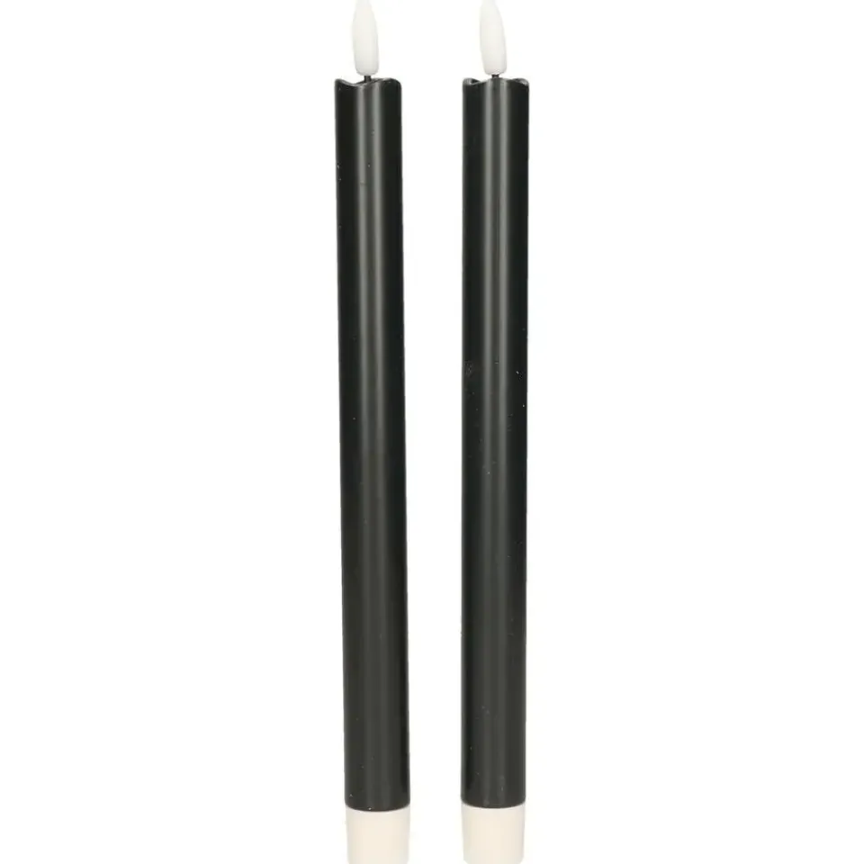 LED dinerkaarsen 2x stuks in de kleur zwart. De kaarsen zijn ongeveer 24 cm lang en geven een warm wit licht. Deze kaarsen zijn ideaal als decoratie voor elke speciale gelegenheid. Ze geven een warm, rustgevend licht en zijn veilig in gebruik. Deze LED dinerkaarsen zijn perfect om uw tafel een aangename sfeer te geven. Met 3D lont. Voeding per kaars: 2 AAA batterijen (niet inbegrepen).