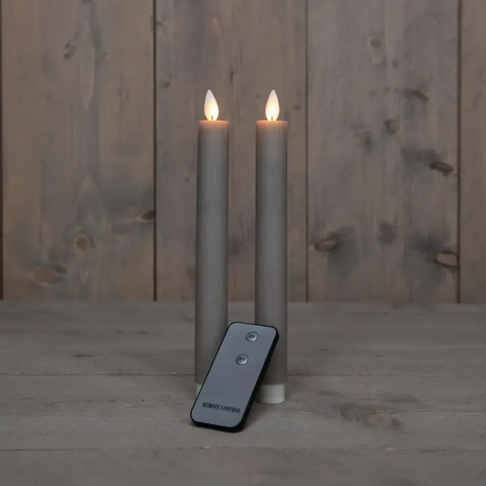 Prachtige LED dinerkaarsen in de kleur taupe/grijs. Deze set bestaat uit 2 stuks kaarsen, elk 23 cm hoog. Met de bijgeleverde afstandsbediening bedien je de kaarsen gemakkelijk. De warme gloed en bewegende vlam zorgen voor een gemoedelijke sfeer. Voeding per kaars: 2 AA batterijen (niet inbegrepen). Geniet van de perfecte sfeer met deze LED dinerkaarsen met warm wit licht.