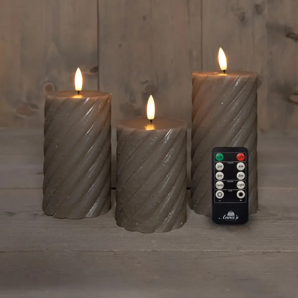 Luxe LED kaarsenset van 3x stuks stompkaarsen. Deze LED kaarsen in een prachtige kleur taupe grijs en hebben een luxe swirl afwerking. De kaarsen zijn gemaakt van hoogwaardig materiaal en geven een mooi, warm licht. Ze zijn veilig om te gebruiken omdat ze geen hitte of rook produceren. De set wordt geleverd met 3 verschillende groottes. waardoor je verschillende decoratieve opties hebt. Geniet van de sfeer die deze LED kaarsen geven. Formaat kaarsen: 7,5 x 10 cm, 7,5 x 12,5 cm en 7,5 x 15 cm. Voeding per kaars: 3 AAA batterij (niet inbegrepen). Met de meegeleverde afstandsbediening kun je de timer functie inschakelen maar je kunt ook het licht van de kaarsen dimmen.