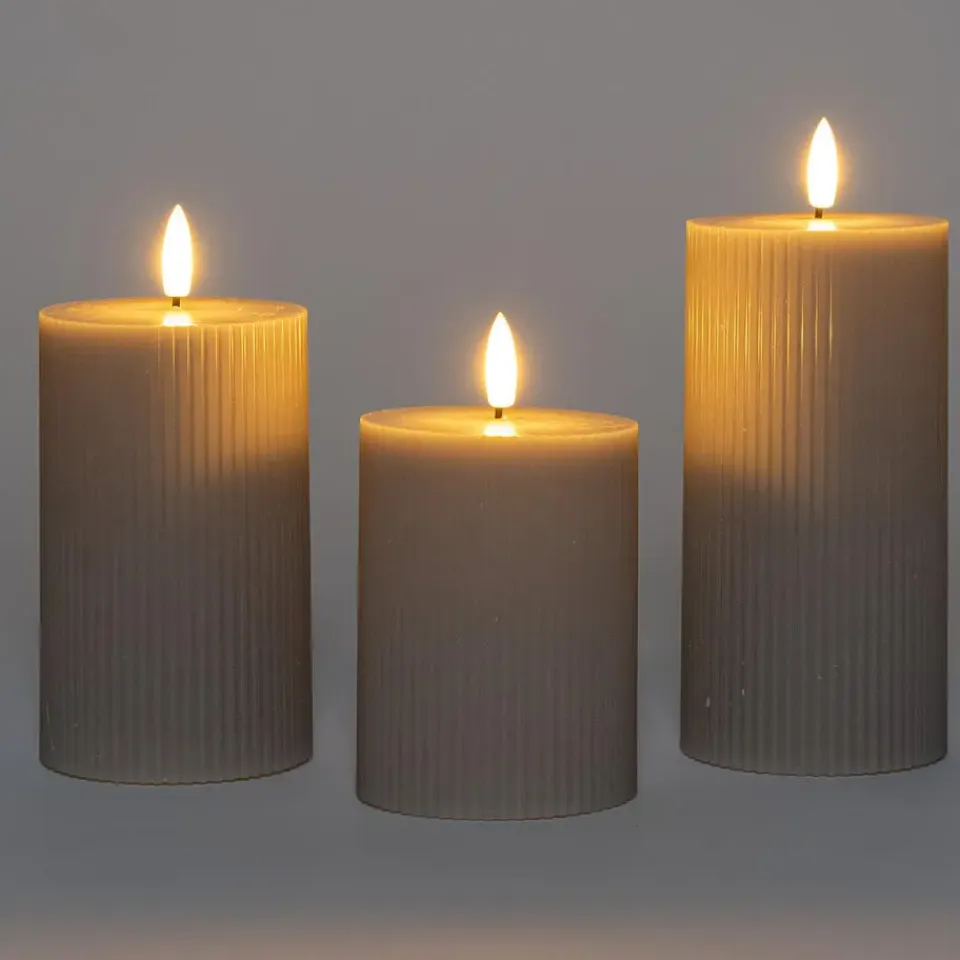 Deze LED kaarsen/stompkaarsen set is een perfecte toevoeging aan elke kamer. De set bestaat uit 3 stuks kaarsen in de kleuren taupe grijs, met een ribbel decoratie. De kaarsen zijn uitgerust met LED licht waardoor ze een warm, sfeervol licht geven. Ze zijn veilig omdat ze geen hitte geven en geen wax morsen. De LED kaarsen zullen een perfecte decoratie zijn in elke kamer en zullen een prachtig accent toevoegen aan elke tafel. Formaat kaarsen: 7,5 x 10, 7,5 x 12,5 en 7,5 x 15 cm. Voeding per kaars: 3 AAA batterij (niet inbegrepen). – Inclusief afstandsbediening- warm wit licht- mooie ribbel afwerking