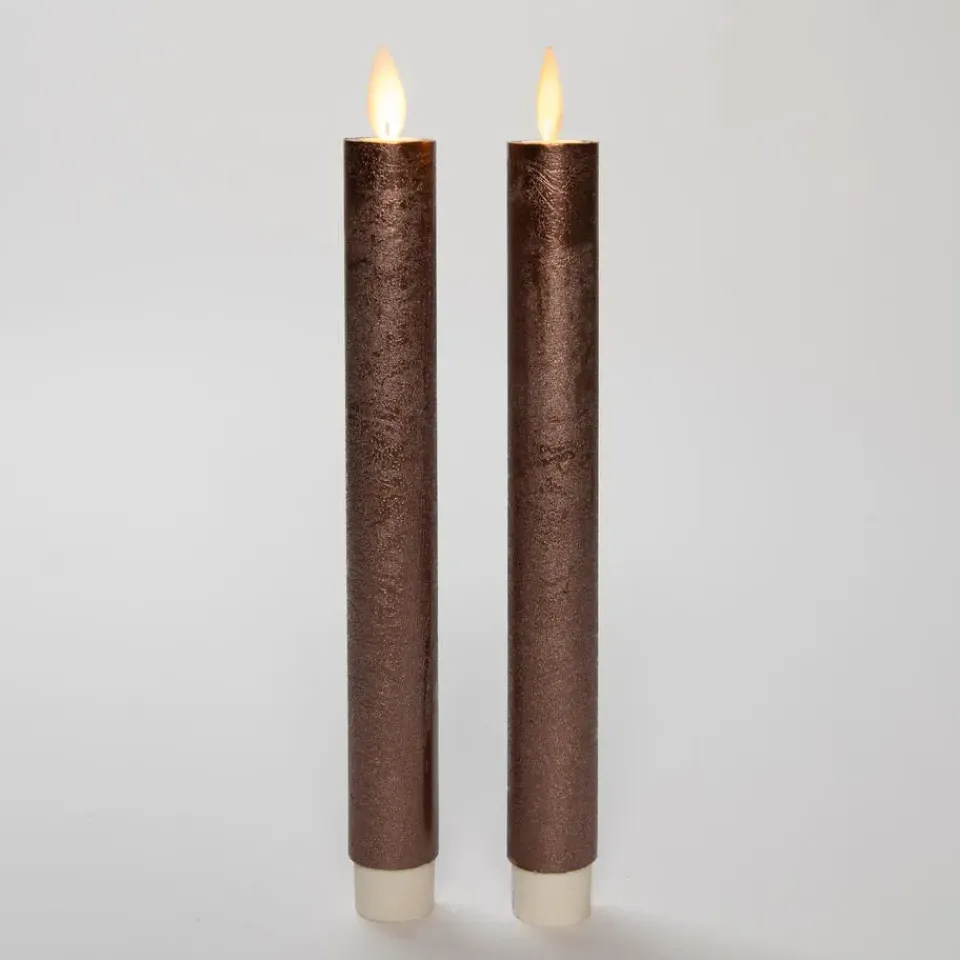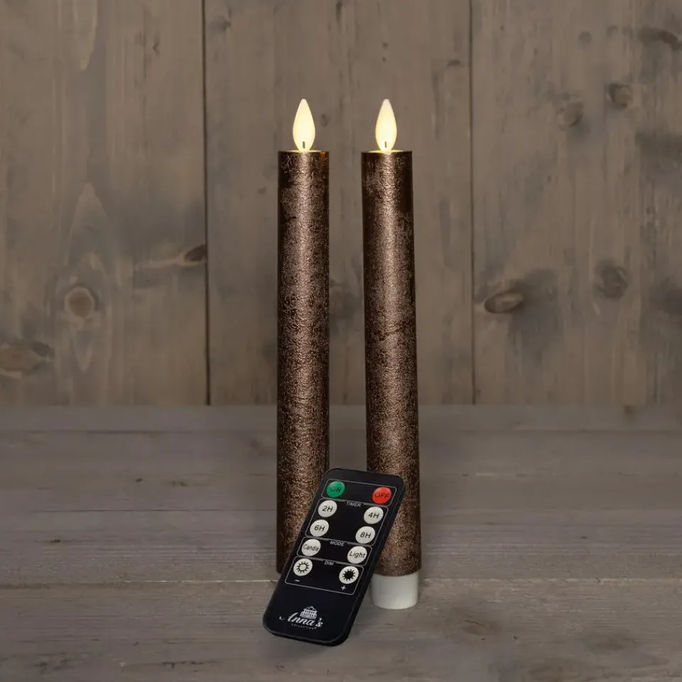 LED dinerkaarsen 2x stuks van 23 cm. Voeg een vleugje luxe toe aan je diner met deze set van 2x stuks dinerkaarsen in de kleur brons. Met een hoogte van 23 cm en LED bewegende vlam, zorg je voor een warme en elegante sfeer. Gemakkelijk te bedienen met de meegeleverde afstandsbediening, inclusief dimmer en timer functie. 2 AA batterijen per kaars worden niet meegeleverd. Laat de betovering van kaarslicht zonder zorgen om open vuur je tafel verfraaien met deze stijlvolle LED dinerkaarsen.