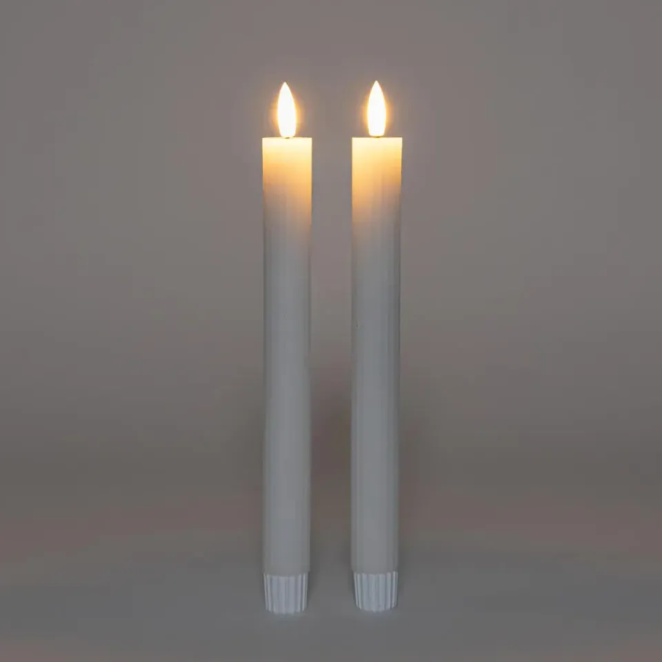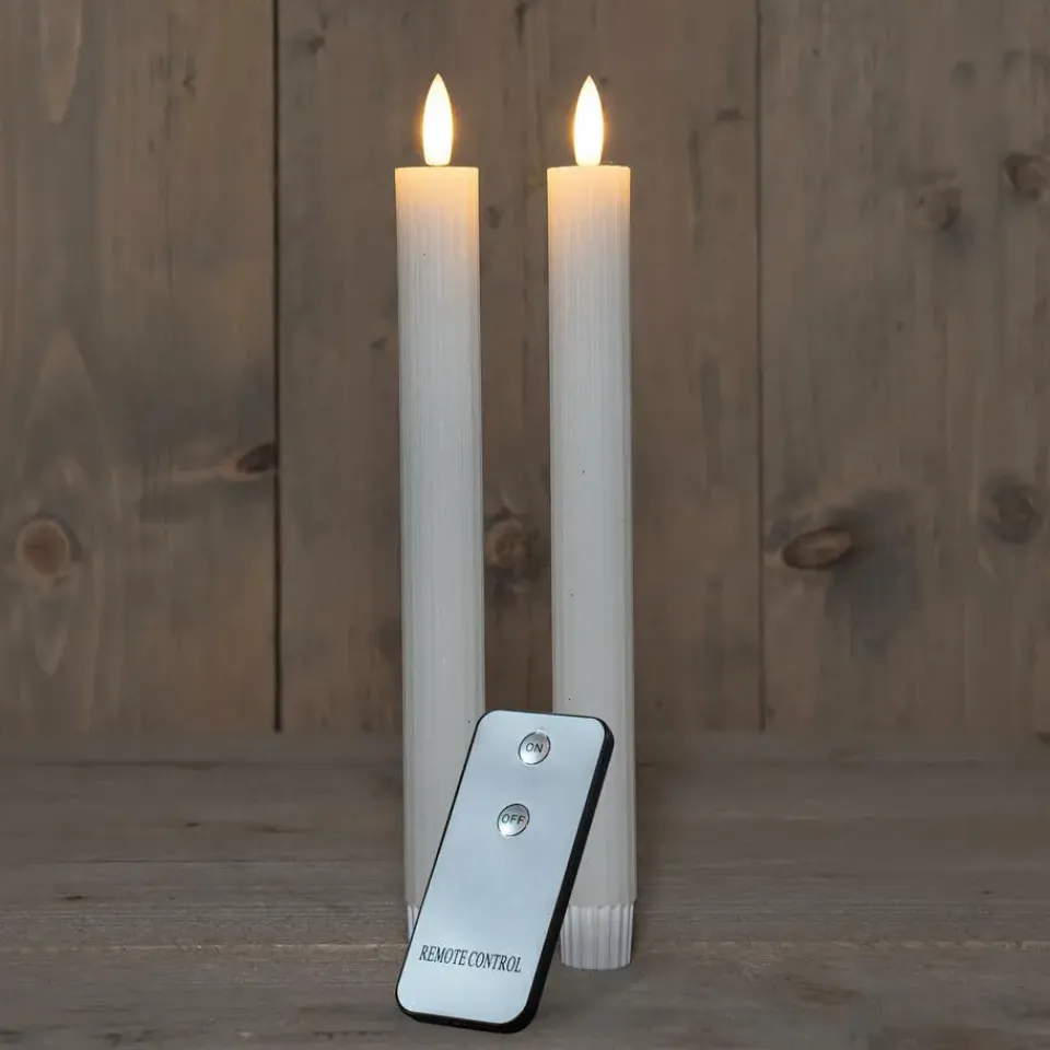 LED kaarsen/dinerkaarsen 2x stuks in de kleur wit. Deze ribbel LED dinerkaarsen zijn ongeveer 23 cm lang en geven een warm wit licht. Deze kaarsen zijn ideaal als decoratie voor elke speciale gelegenheid. Ze geven een warm, rustgevend licht en zijn veilig in gebruik. Deze LED dinerkaarsen zijn perfect om uw tafel een aangename sfeer te geven. Met 3D vlam. Voeding per kaars: 2 AAA batterijen (niet inbegrepen). Inclusief afstandsbediening om de kaarsen op afstand te kunnen bedienen.