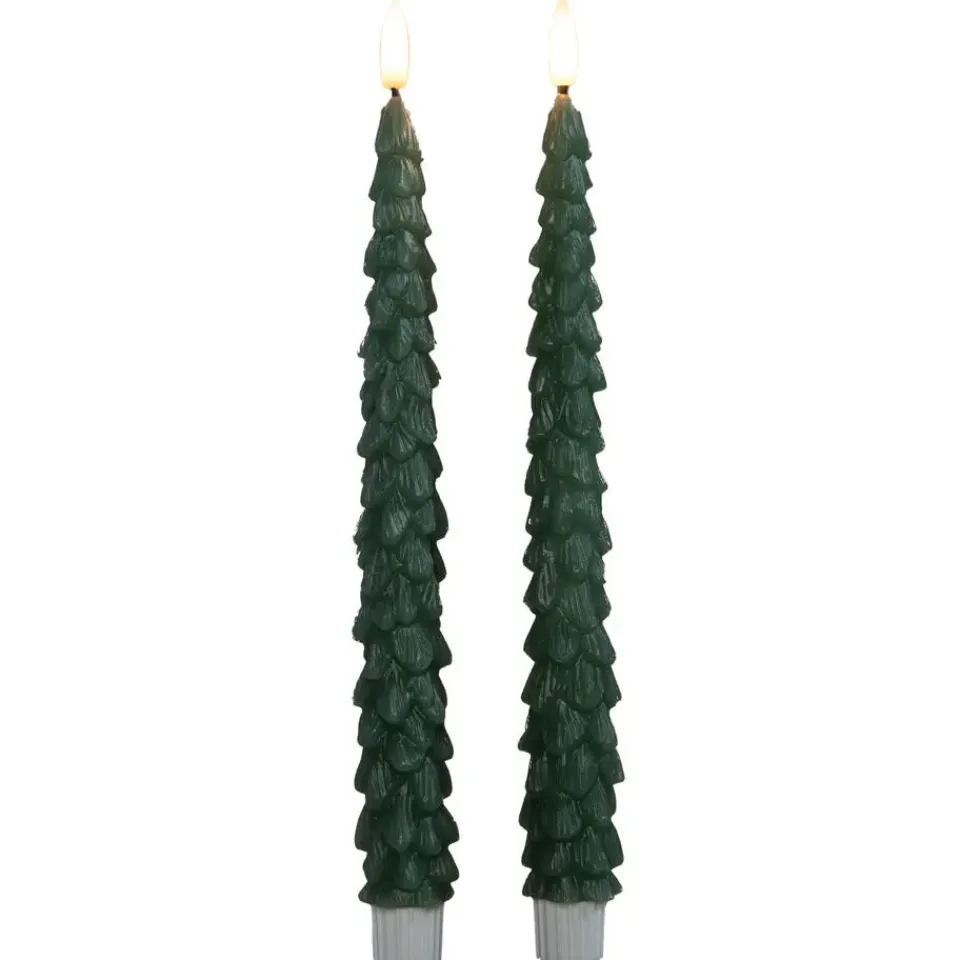 LED kaarsen/dinerkaarsen in kerstboom vorm. Set van 2x stuks kaarsen in de kleur groen. Met een hoogte van 27 cm en aangedreven door 2×2 AAA batterijen per kaars (niet inbegrepen), voegen ze een elegante gloed toe zonder open vuur. De meegeleverde afstandsbediening biedt gemak met timer- en dimmerfuncties voor de perfecte sfeer.