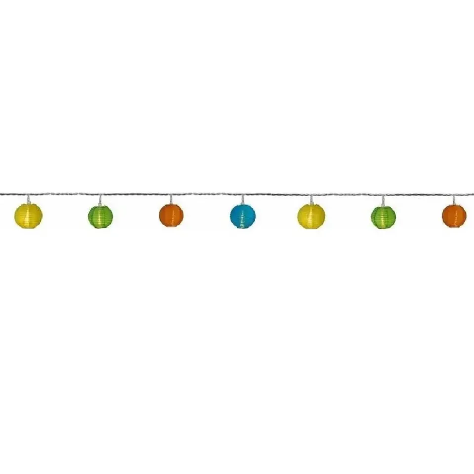 Soort verlichting: LED. Kleur lampionnen: multi (gekleurd: geel, groen, oranje en blauw). Kleur licht: warm wit. Kleur snoer: wit. Totale lengte lichtsnoer: 2,5 meter. Lengte snoer met lampjes: 2,5 meter. Aantal lampjes/lampionnetjes: 10. Diameter per lampion: 2,5 cm. Lengte aanloopsnoer: 2 meter. IP44 spatwaterdicht. Dit lichtsnoer werkt op zonne-energie: door het zonnepaneel op te laden in de zon branden de lampjes wanneer het donker is.