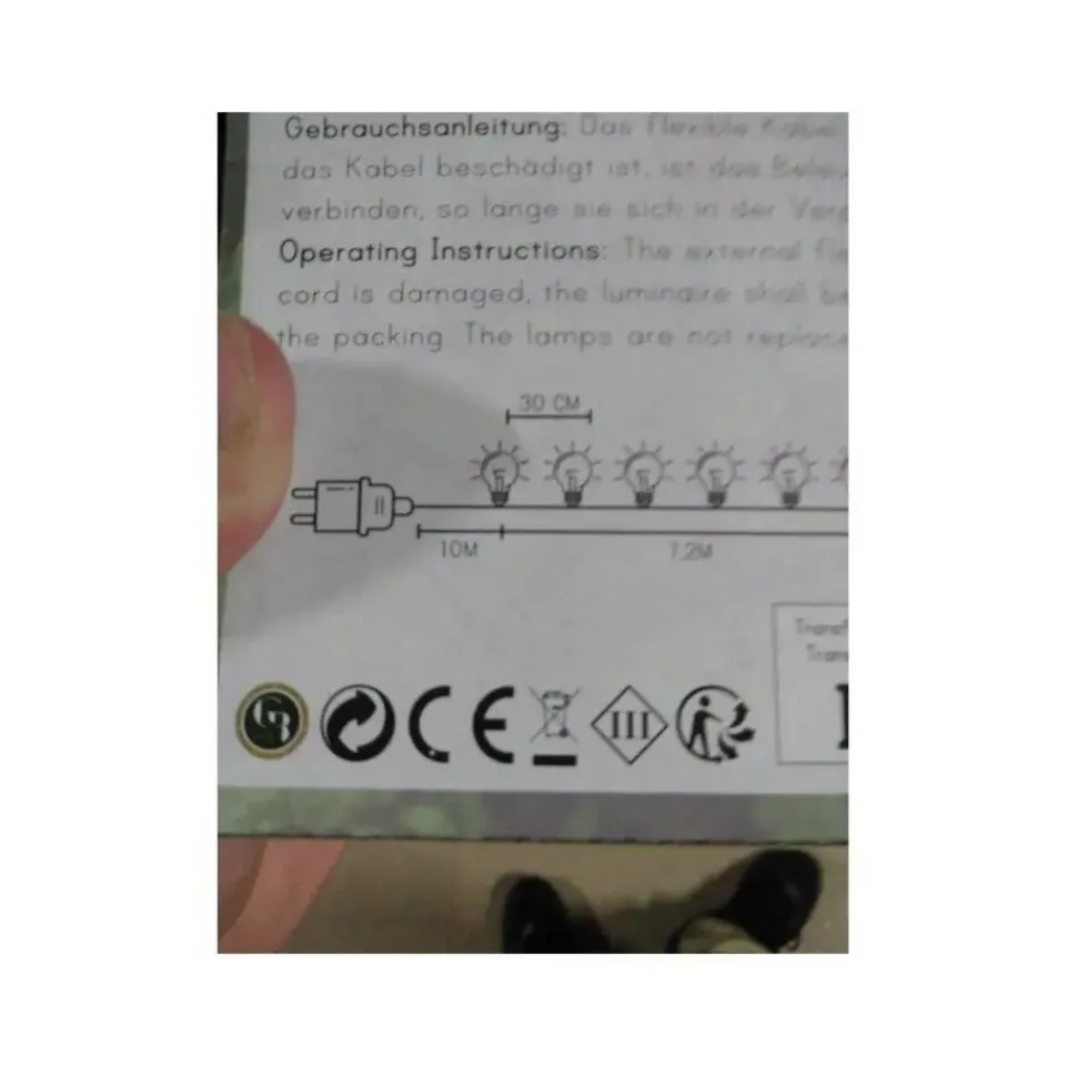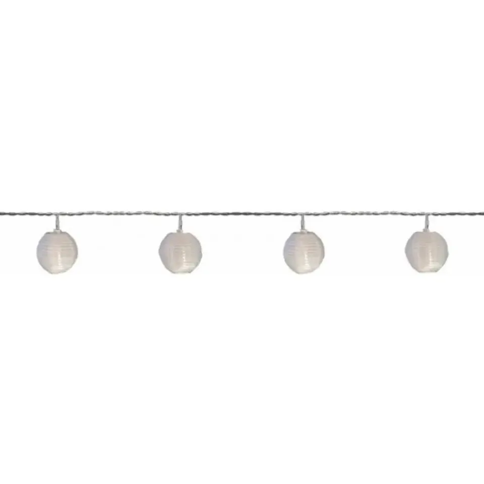 Soort verlichting: LED. Kleur licht: warm wit. Kleur snoer: wit. Totale lengte lichtsnoer: 17,2 meter. Lengte snoer met lampjes: 7,2 meter. Aantal lampjes/lampionnetjes: 24. Diameter per lampion: 7,5 cm. Lengte aanloopsnoer: 10 meter. IP44 spatwaterdicht. Aansluiten op een geaard stopcontact wordt aangeraden.