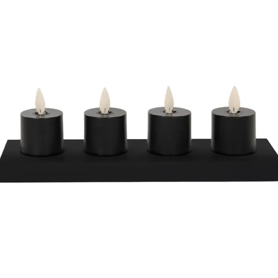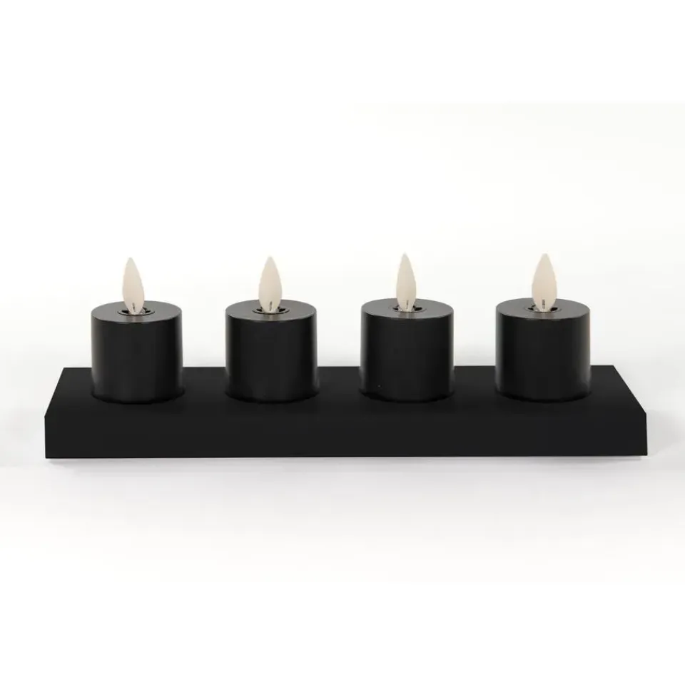 Set van 4x stuks theelichtjes/waxinelichtjes LED kaarsjes van kunststof. In stijlvol zwart en met een formaat van D3,8 x H6 cm, voegen deze kaarsjes een warme sfeer toe aan elke ruimte. Voorzien van een inductie oplaadstation en inclusief afstandsbediening voor ultiem gemak en een realistische bewegende vlam voor een sfeervolle uitstraling. Geef jouw omgeving een vleugje gezelligheid zonder gedoe met batterijen – eenvoudig opladen met meegeleverde USB kabel en genieten van deze prachtige LED theelichtjes. IP klasse IP20. Type batterij: Li-ion 120mAh.