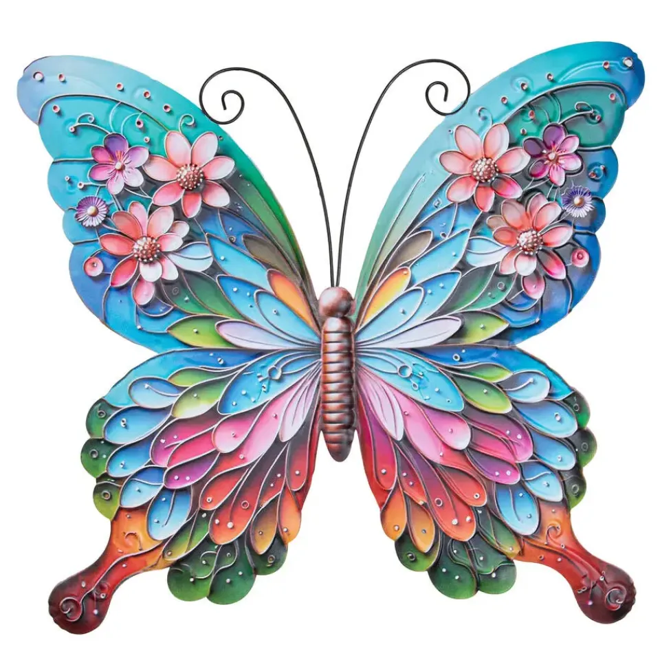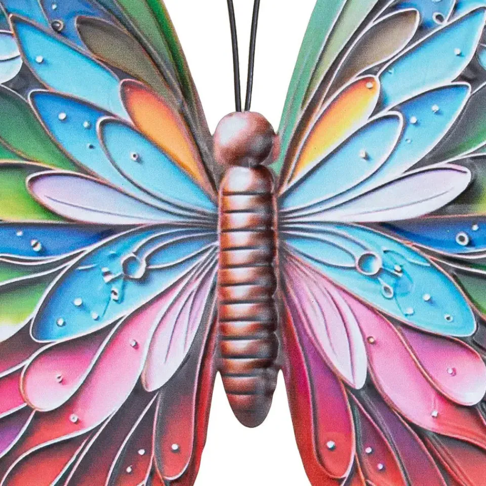 Wanddecoratie vlinder voor buiten in een prachtige kleurenmix voor aan de muur, wand of schutting. Fleur je tuin op met de decoratieve muurvlinder. Eenvoudig te bevestigen. Bevestigingsmateriaal niet inbegrepen. Materiaal: metaal. Afmeting: ca. 17 x 18 cm. Merk: Anna’s Collection. Buiten en tuin decoratie beelden in mooie kleuren. De vlinders hebben zeer veel mooie details.