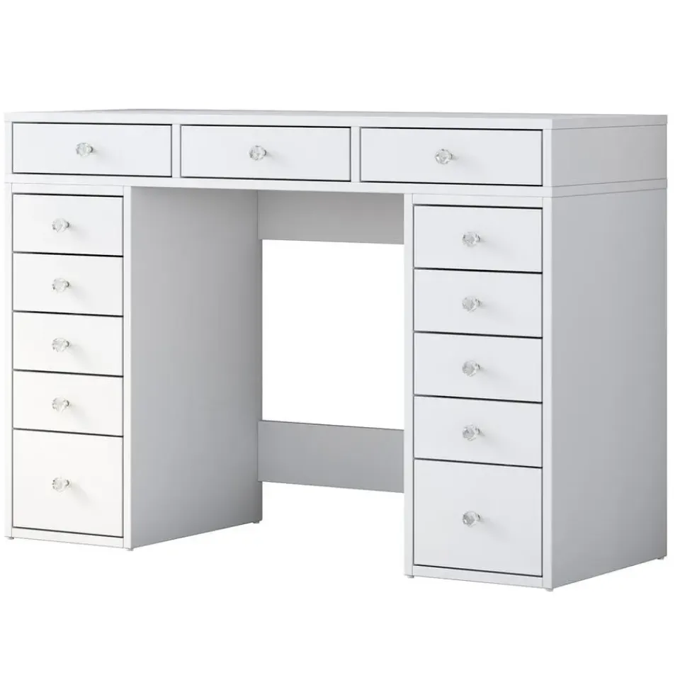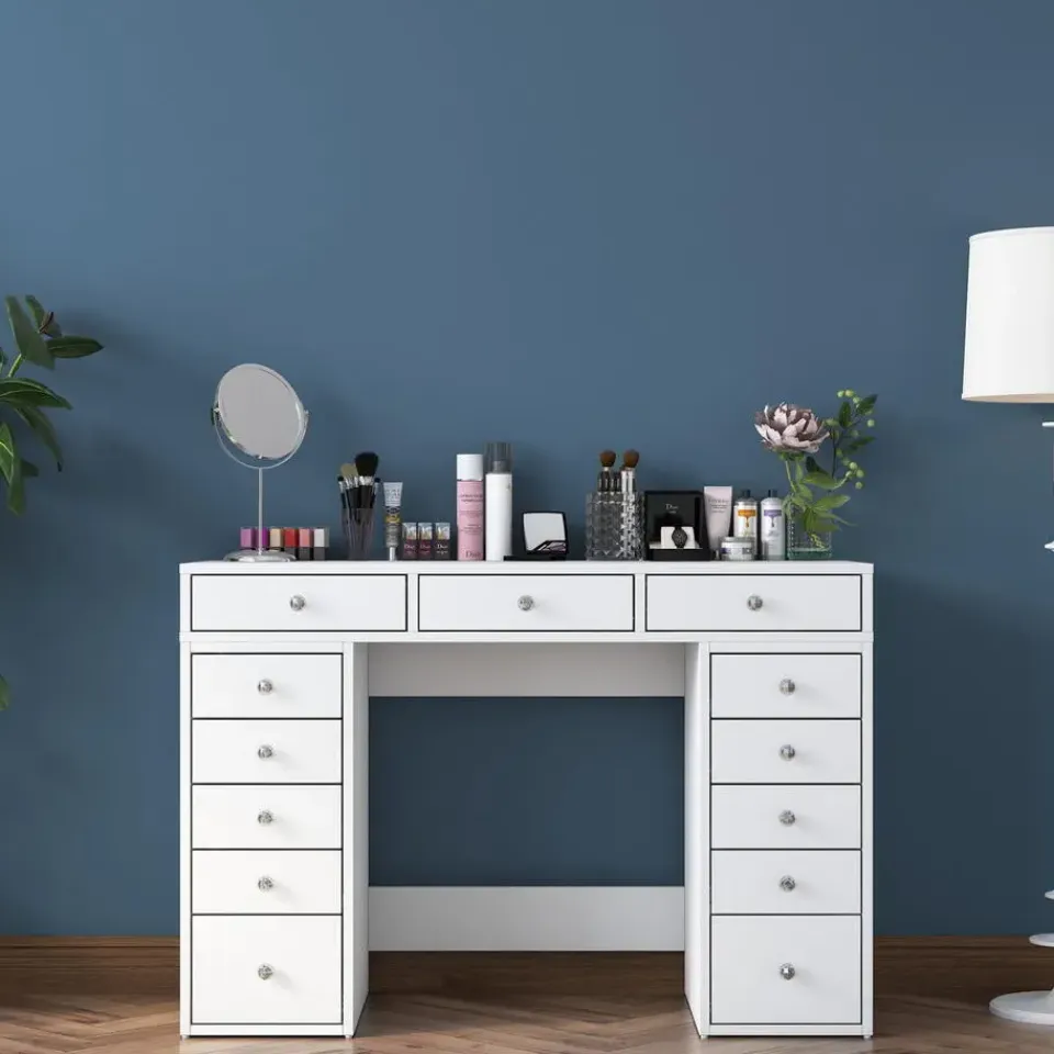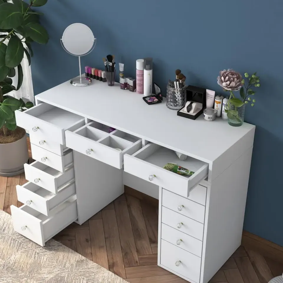 Materiaal: De kaptafel is vervaardigd uit melamine, een materiaal dat bekend staat om zijn duurzaamheid en onderhoudsgemak. Melamine is krasbestendig en eenvoudig schoon te maken, waardoor het ideaal is voor dagelijks gebruik.