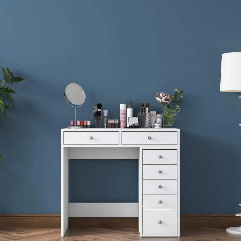 Materiaal: De kaptafel is vervaardigd uit melamine, een materiaal dat bekend staat om zijn duurzaamheid en onderhoudsgemak. Melamine is krasbestendig en eenvoudig schoon te maken, waardoor het ideaal is voor dagelijks gebruik in drukke huishoudens.