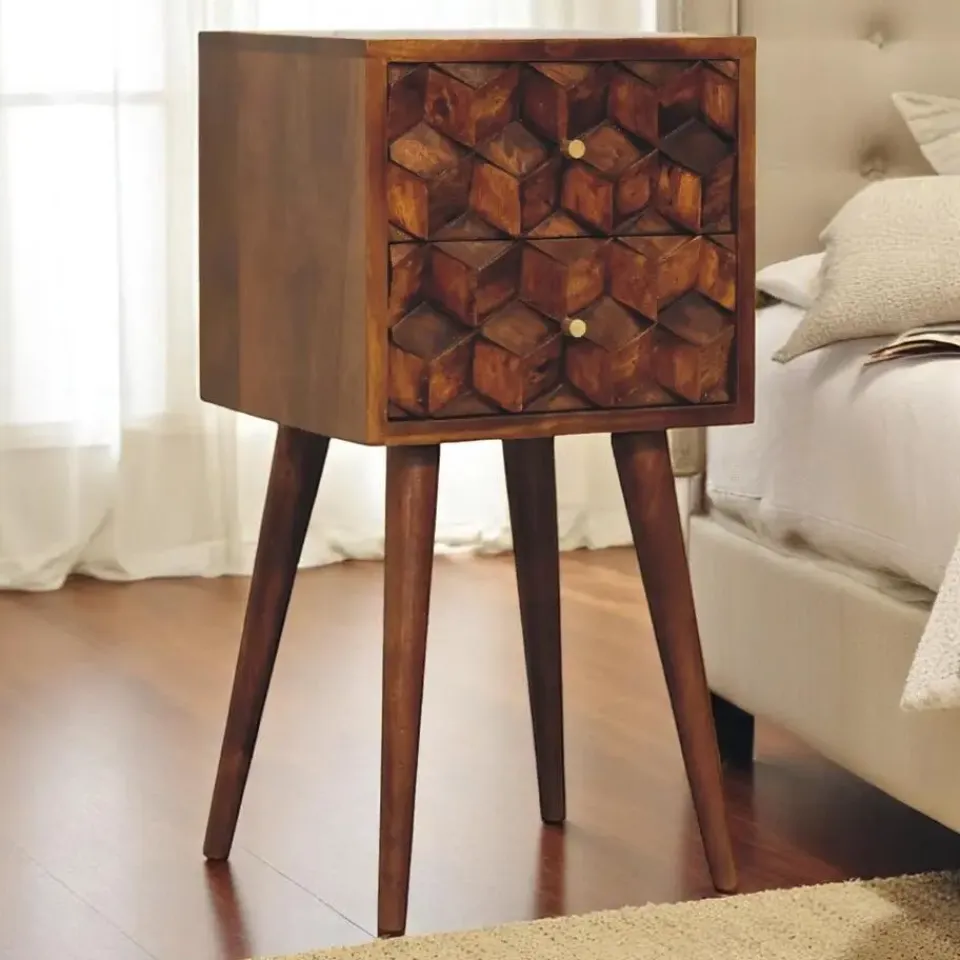 Dit prachtig ontworpen nachtkastje is gemaakt van 100% massief mangohout en heeft een fijne kastanjebruine afwerking. Het beschikt over 2 kleine kubusvormige lades die het stuk extra karakter en dimensie geven. Het heeft 4 Scandinavische stijl poten om uw huis te moderniseren en kan in krappe ruimtes worden geplaatst, geschikt voor elk type interieur. Dit petite product is onderdeel van de Recession Collection.