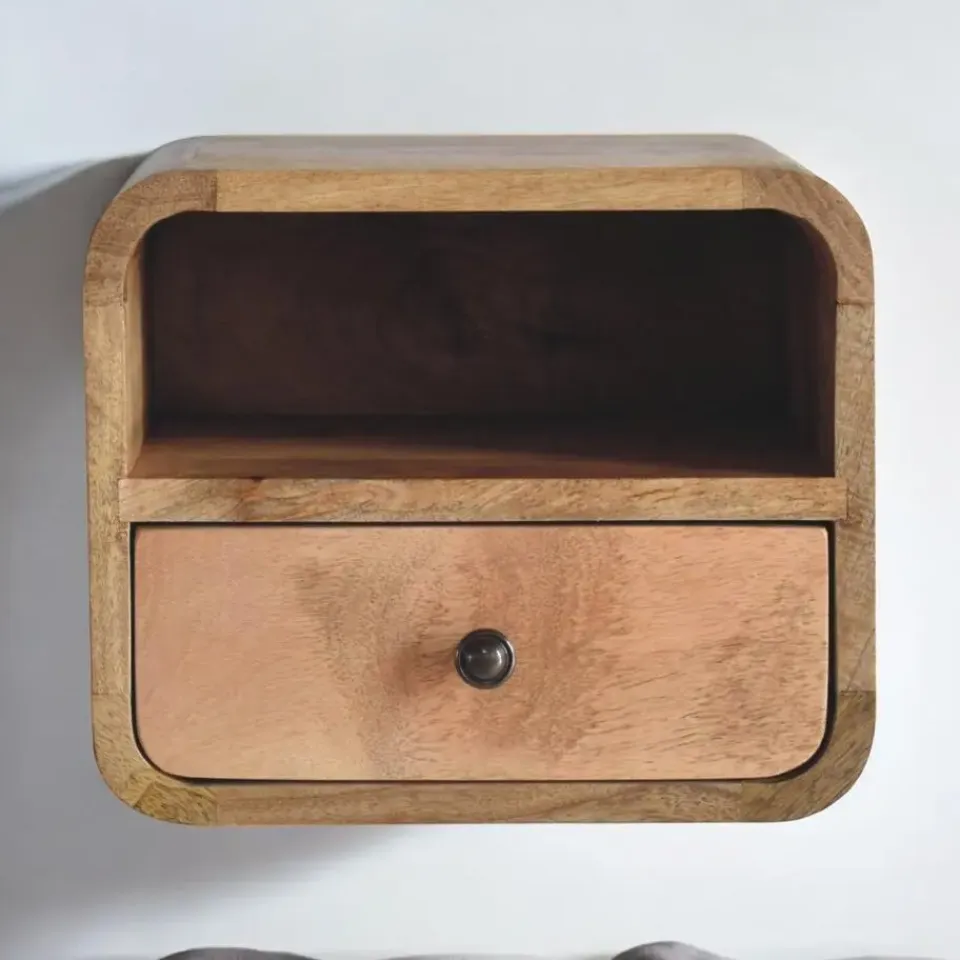 Wij presenteren de extra wandnachtkast met gebogen eiken afwerking en open sleuf. Dit ultra compacte, aan de muur gemonteerde nachtkastje is perfect voor snacks, drankjes of een kleine lamp. Gemaakt van 100% massief mangohout met een elegante eiken afwerking, heeft het zachte, afgeronde randen die naadloos in elke kamer passen. Uitgerust met 1 lade en een open plank aan de onderkant, voegt dit kleine meubel veelzijdigheid toe aan uw huis. Het maakt deel uit van onze Recession-collectie.
