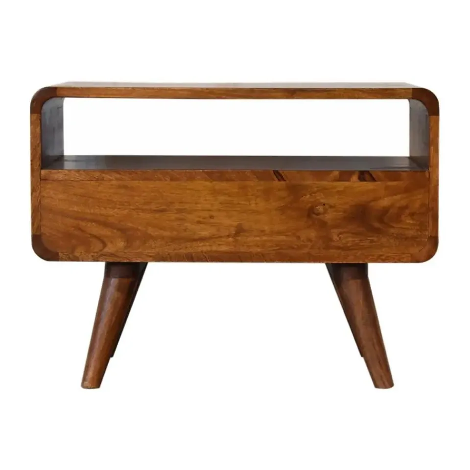 De mini-versie van onze bekende IN309. Gemaakt van 100% massief mangohout in kastanjekleur. Voorzien van afgeronde randen, twee lades met glanzende knoppen, een open vak en vier Scandinavische poten. Dit compacte meubel combineert stijl met functionaliteit. Onderdeel van de Recession Collection.
