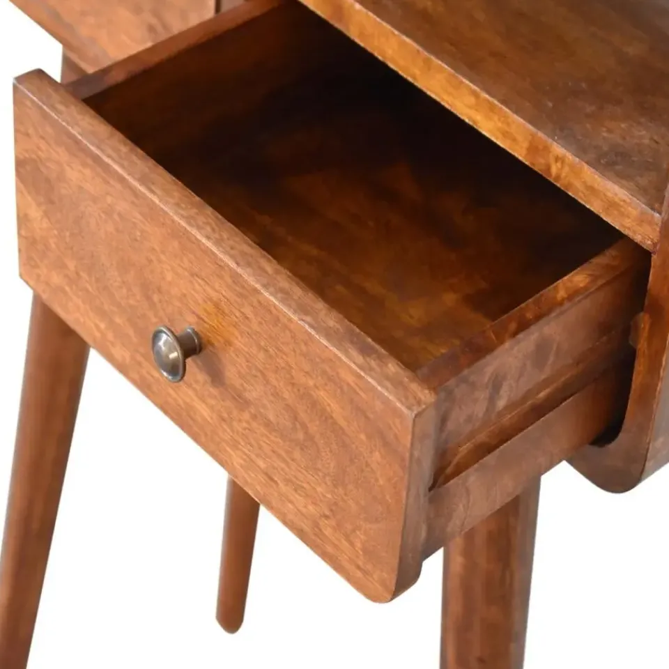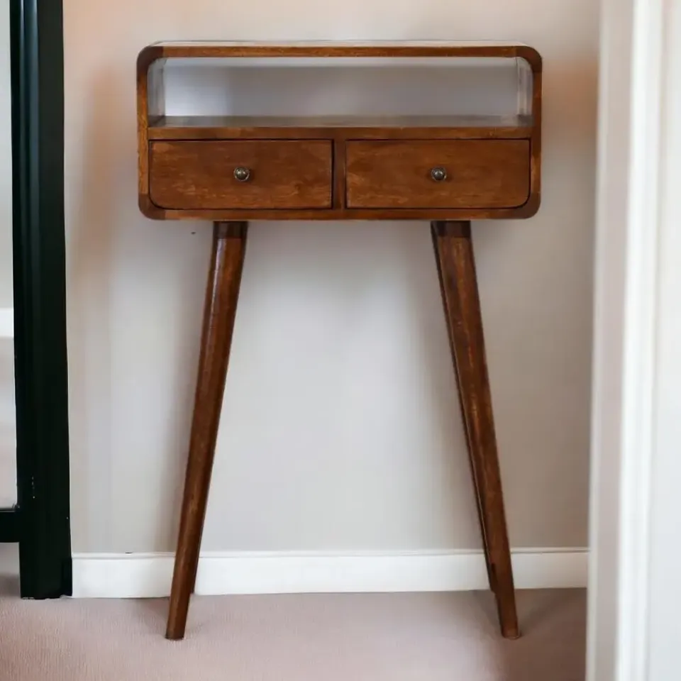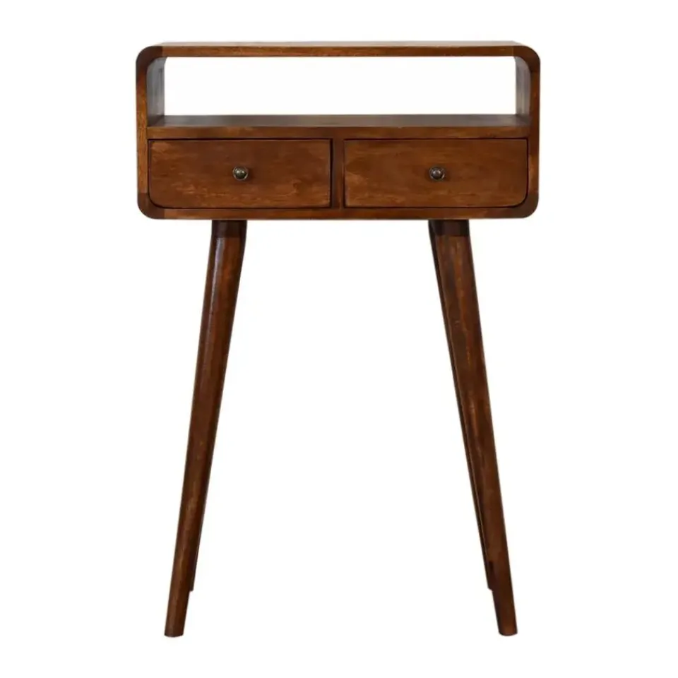 De mini-versie van onze populaire IN311. Deze eenvoudige en elegante console heeft gebogen randen, twee lades en een open vak, glanzende knoppen en vier Scandinavische poten. Afgewerkt in kastanje. Onderdeel van de Recession Collection.