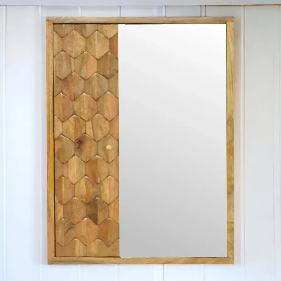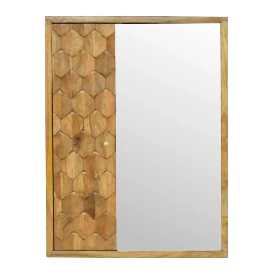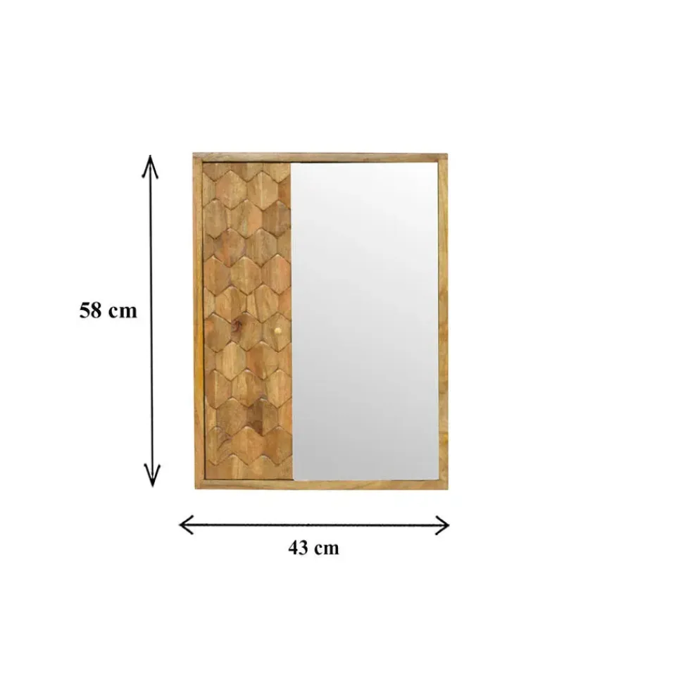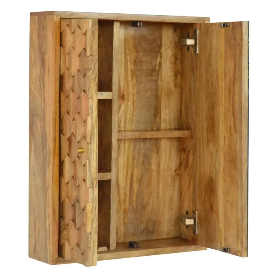Voltooi uw assortiment met de spiegelkast, gemaakt van 100% massief mangohout in een eikenachtige afwerking, met een ananascarving aan de voorkant en een schuifspiegel. Het heeft een paar planken aan de binnenkant voor discreet opslaan van kleine spulletjes in de badkamer of de gang. Het zou geweldig staan, alleen of in combinatie met de andere stukken uit het assortiment. Het perfecte accessoire voor het huis.
