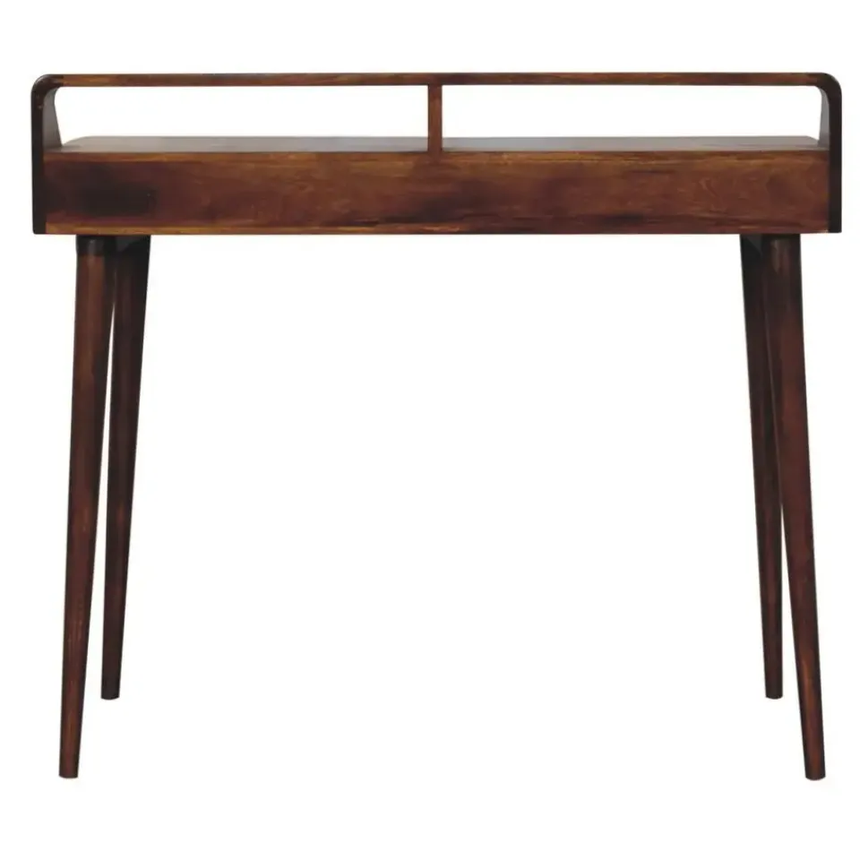 Deze sidetable is vakkundig vervaardigd uit 100% massief mangohout met een rijke kastanjekleurige afwerking die de natuurlijke schoonheid van de houtnerf benadrukt. Het heeft een uniek ontwerp met een licht verhoogde achterkant, wat een verhoogde esthetiek toevoegt die elke hal of woonkamer verfraait. Ondersteund door poten in Noordse stijl en voorzien van 2 handige lades, ideaal voor het opbergen van dagelijkse spullen. De tafel heeft een modern en minimalistisch uiterlijk.