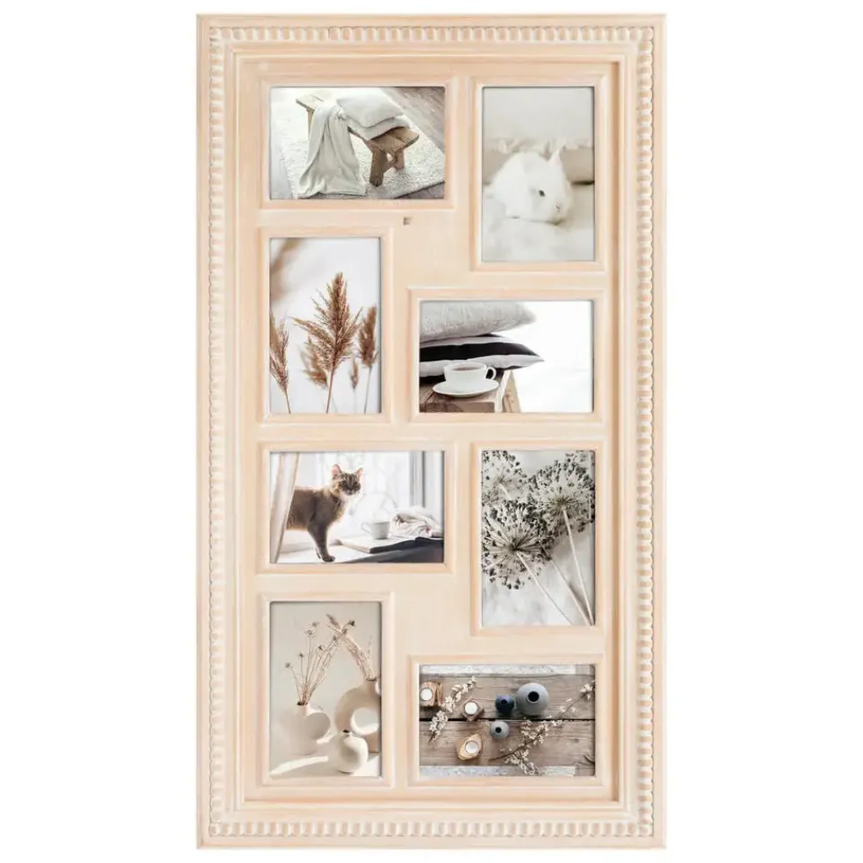 Collage fotolijst uit de Natural serie voor meerdere foto’s. Stel je foto’s tentoon met deze collage fotolijst in de kleur beige. Deze moderne foto collage bestaat uit 8x fotolijstjes voor foto’s met afmetingen van 10 x 15 cm. Materiaal: hout/glas. Merk: Atmosphera. Voorzien van ophangingen op deze verticaal op te hangen. Formaat: 37 x 66 cm. Wissellijst.