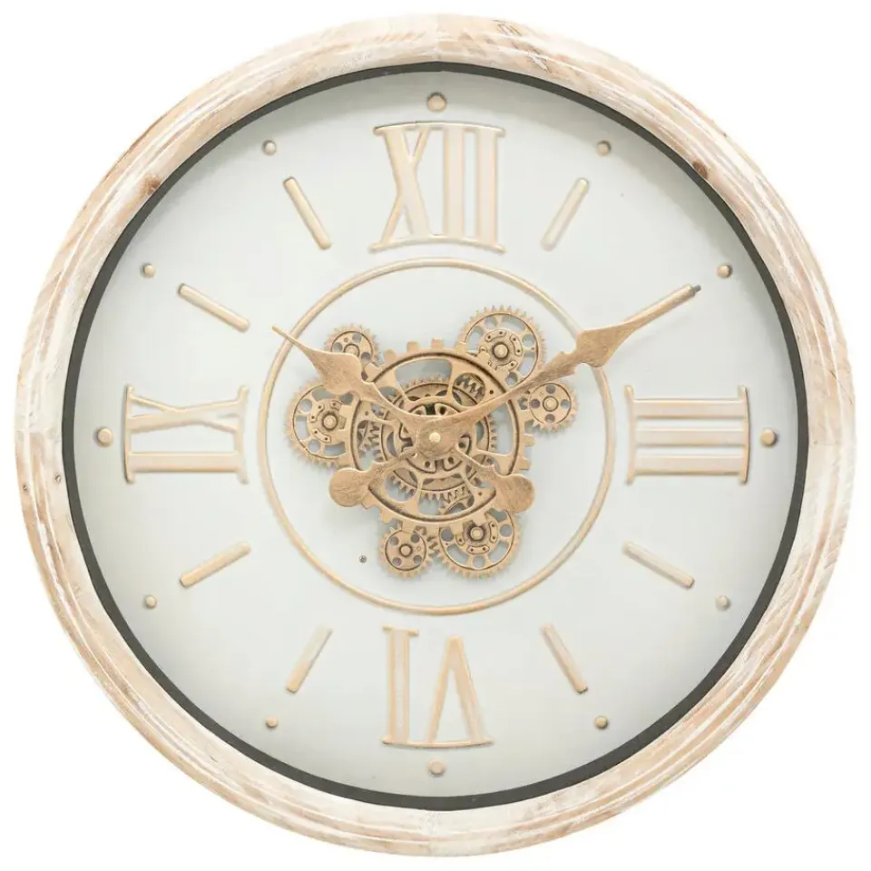 Wandklok Florence Vintage Wood voor aan de muur/wand in de huis/studeerkamer met een diameter van 50 cm en dikte 8.5 cm. Grote klok met zichtbare en werkzame tandwielen. Kleuren: beige/wit/transparant glas. Met Romeinse cijfers. Aan de achterkant zit een ophanging(bevestigingsmateriaal niet inbegrepen). Materiaal: mdf hout/kunststof/glas. Voeding: 3x AA-batterij, niet inbegrepen. Gewicht: 3.4 kilo. Dit klok ornament geeft meteen een luxe rijke sfeer, met een mix van gevoelens tussen nu en toen. Mooie luxe klok, een blikvanger.