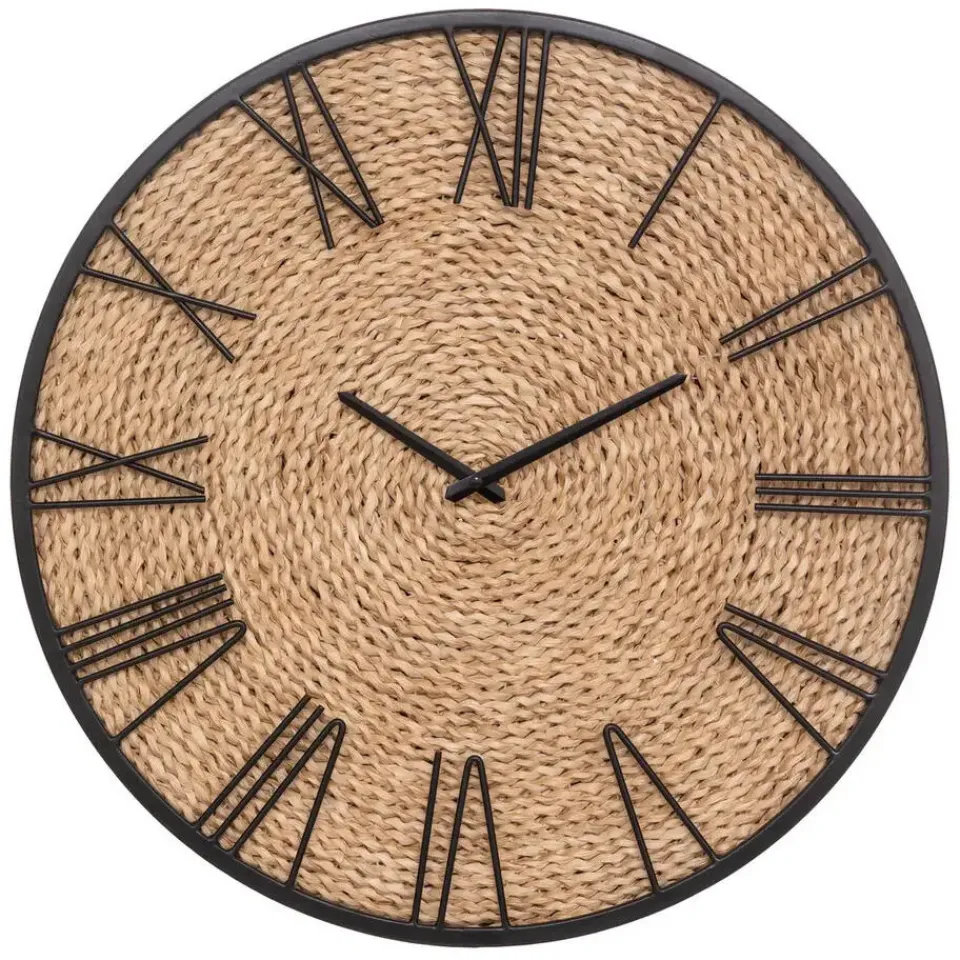 Wandklok Mumbai voor aan de muur/wand in de keuken/huis/studeerkamer met een diameter van 50 cm en dikte 3.5 cm. Kleur: beige en zwart. Met Romeinse cijfers. Aan de achterkant zit een ophanging(bevestigingsmateriaal niet inbegrepen). Materiaal: metaal/jute. Voeding: 1x AA-batterij, niet inbegrepen.
