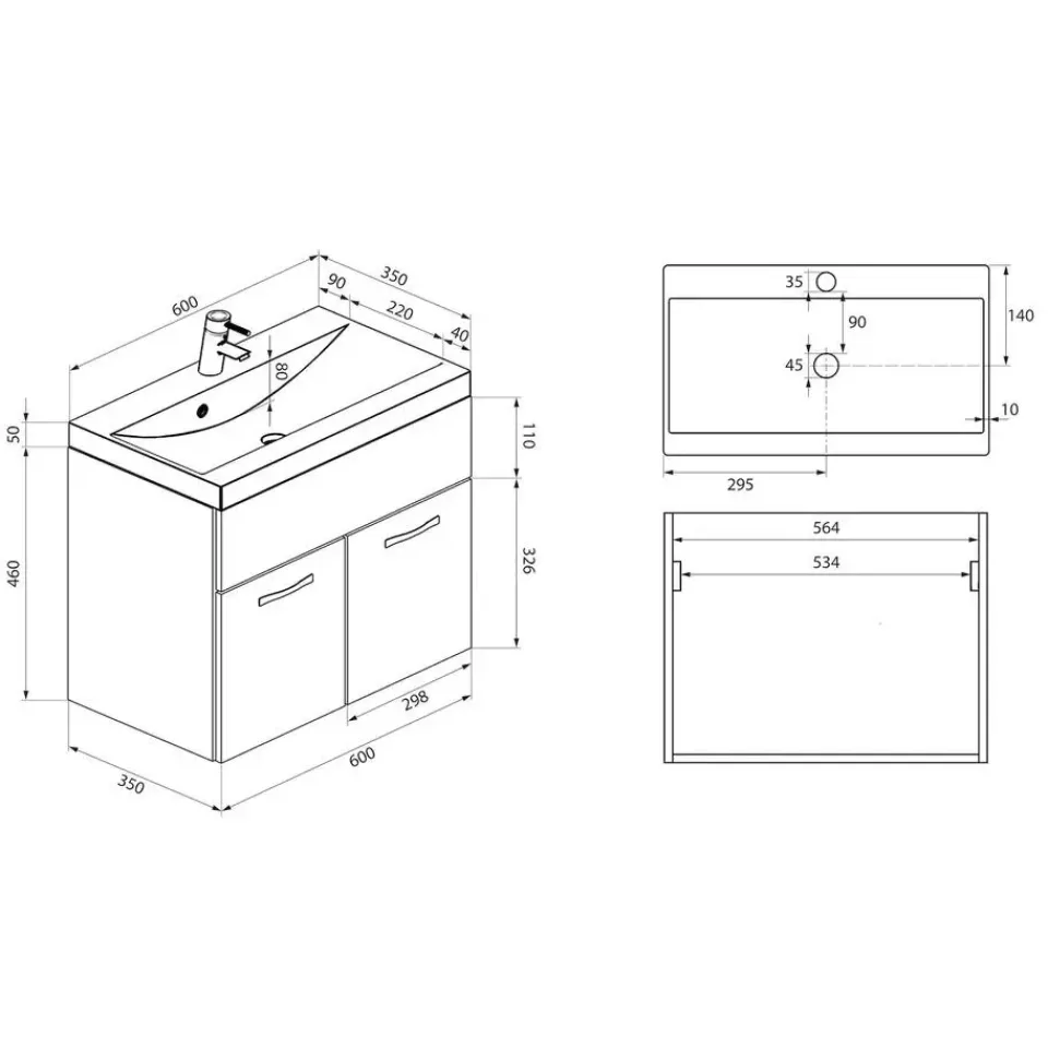 Onderkast met wastafel: 60 x 35 x 51 cm