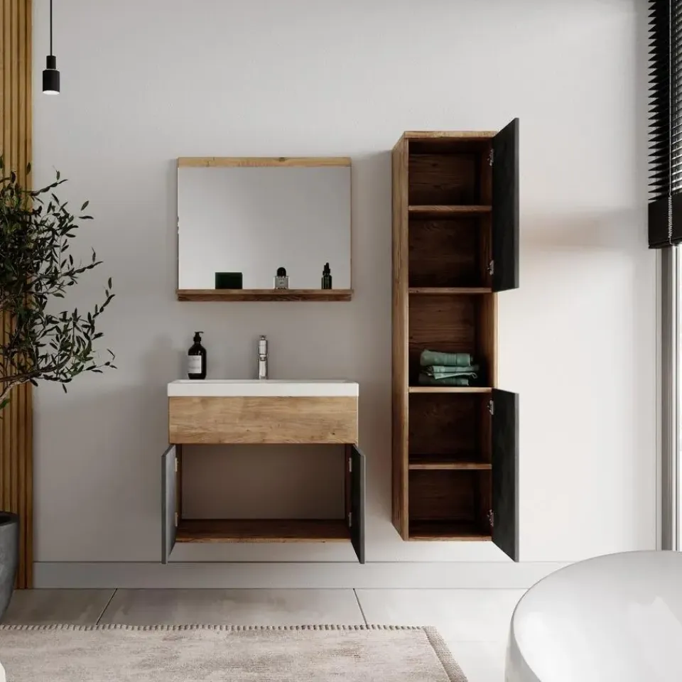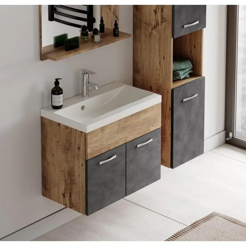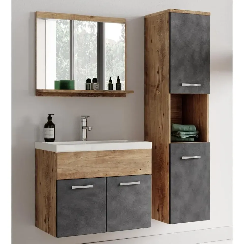 Badkamermeubel set Montreal inclusief wastafel en spiegel en kolomkast.Deze set geeft iedere badkamer, groot of klein, extra bergruimte en een moderne en luxe uitstraling. De deuren van de kolomkast kunnen tijdens montage linksdraaiend of rechtsdraaiend geplaatst worden. Vanwege zijn strakke afwerking is het meubel gemakkelijk schoon te maken.De set is uitgevoerd in kastanje eiken met donker grijs en is gemakkelijk te monteren. De kast is gemaakt van spaanplaat en de wastafel van kunstmarmer.
