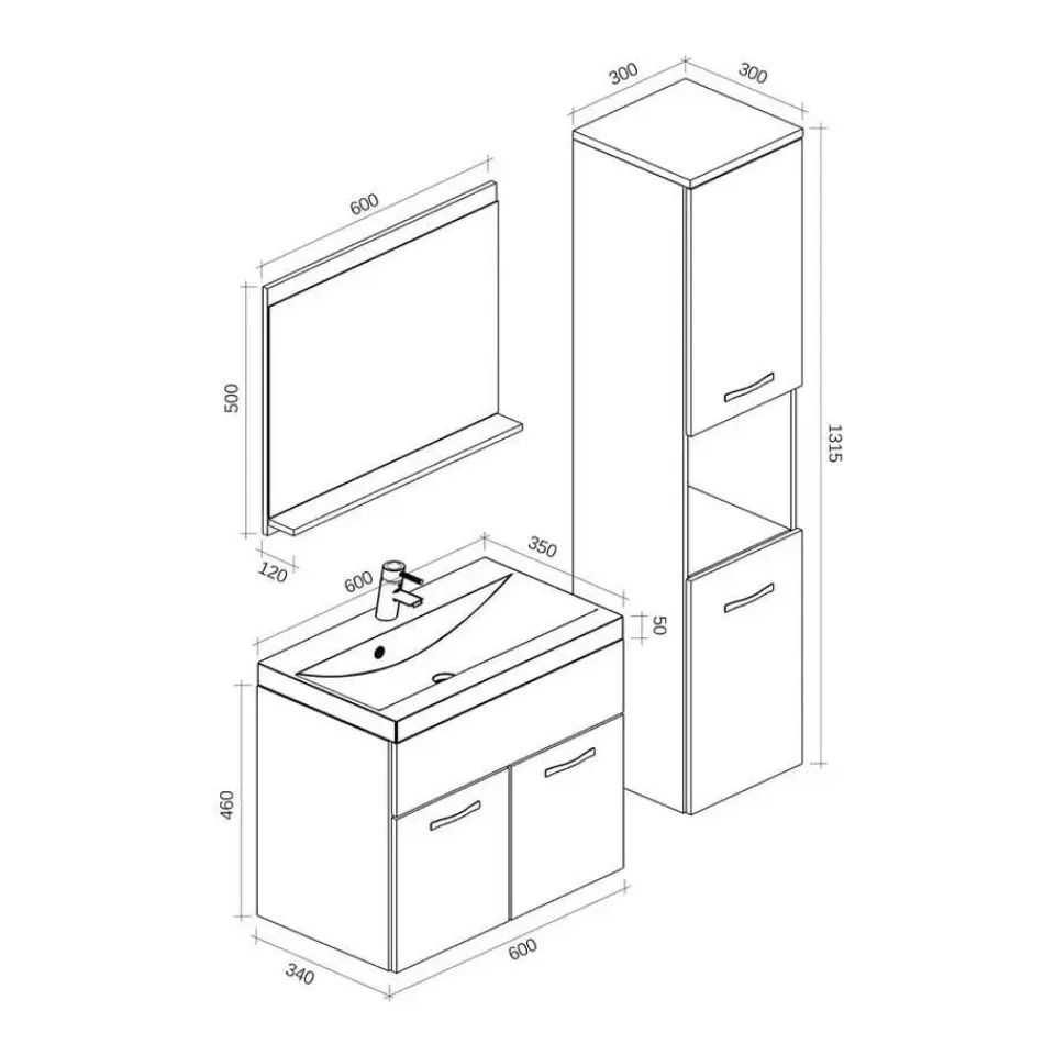 Onderkast met wastafel: 60 x 35 x 51 cm