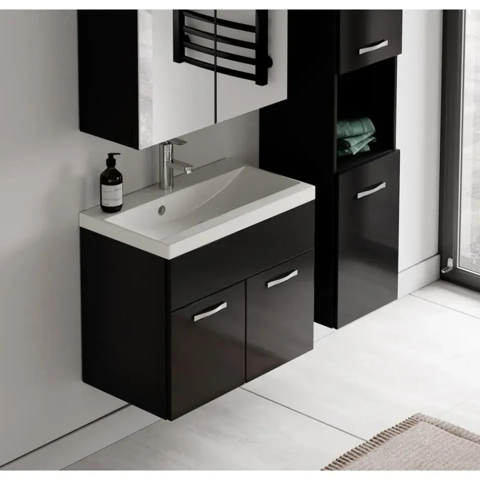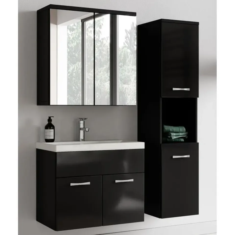 Badkamermeubel set Montreal inclusief, wastafel en spiegelkast en kolomkast.Vanwege zijn strakke afwerking is het meubel gemakkelijk schoon te maken.De set is uitgevoerd in zwart met hoogglans fronts en is gemakkelijk te monteren.