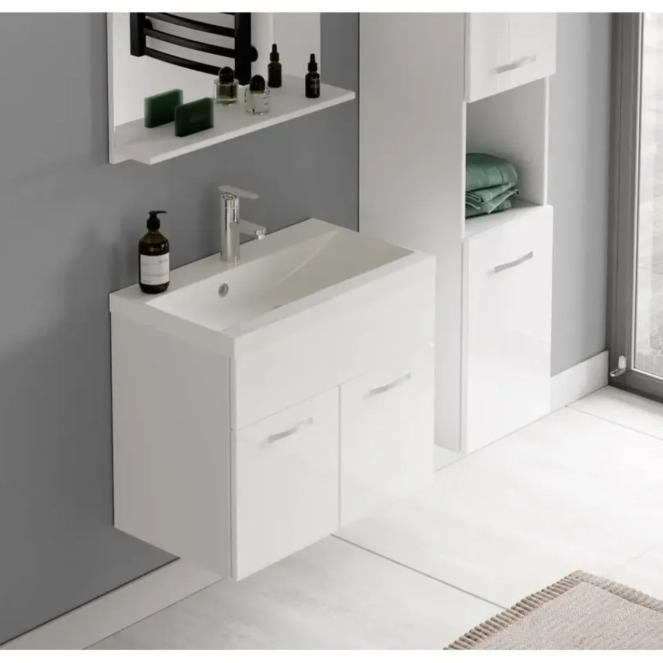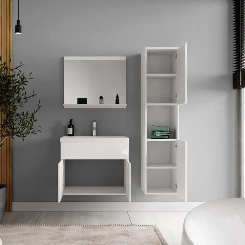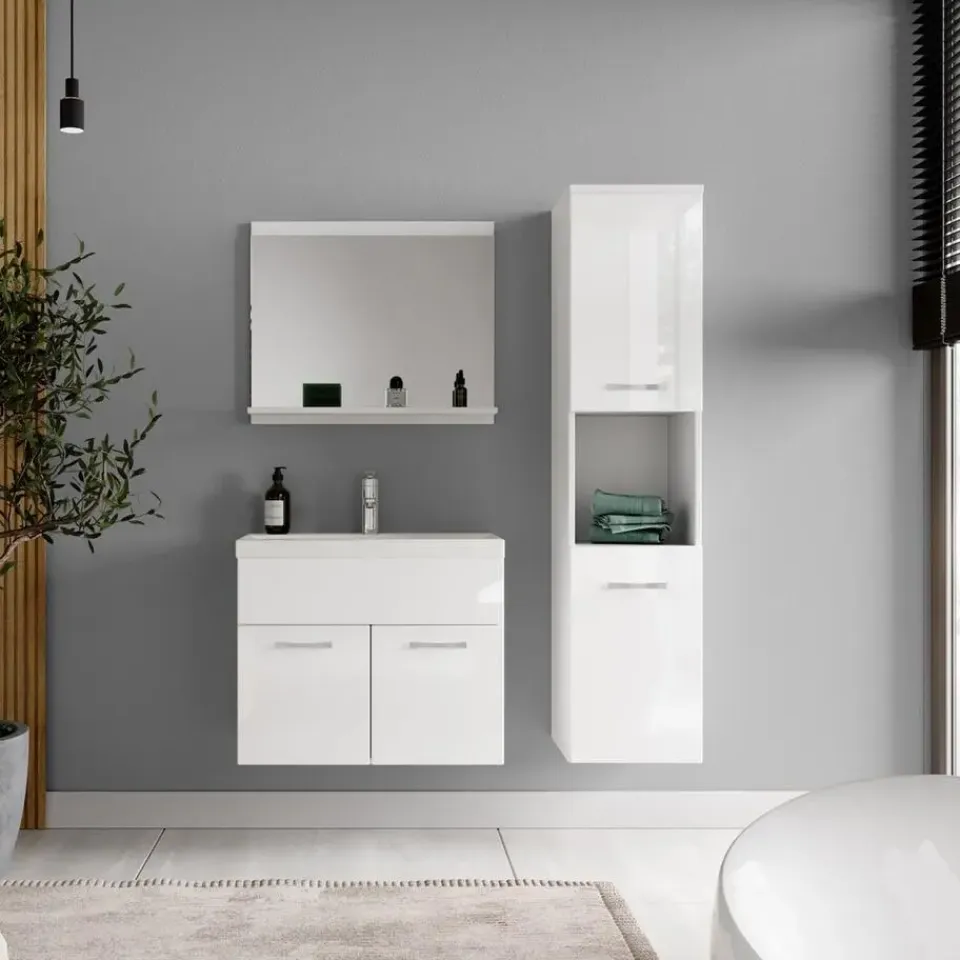 Badkamermeubel set Montreal inclusief wastafel en spiegel en kolomkast.Deze set geeft iedere badkamer, groot of klein, extra bergruimte en een moderne en luxe uitstraling. De deuren van de kolomkast kunnen tijdens montage linksdraaiend of rechtsdraaiend geplaatst worden. Vanwege zijn strakke afwerking is het meubel gemakkelijk schoon te maken.De set is uitgevoerd in wit met hoogglans fronten en is gemakkelijk te monteren. De kast is gemaakt van spaanplaat en de wastafel van kunstmarmer.