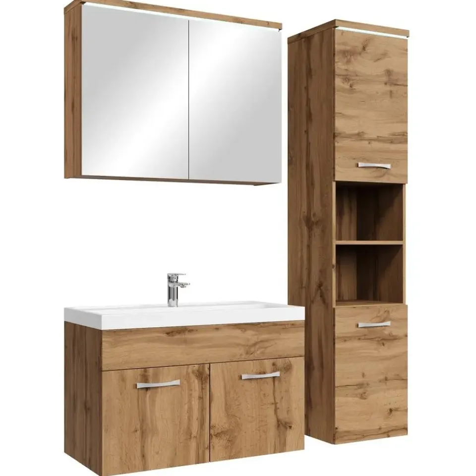 Badkamermeubel set Paso inclusief, wastafel en spiegelkast en kolomkast.Vanwege zijn strakke afwerking is het meubel gemakkelijk schoon te maken.De set is uitgevoerd in eiken kleur en is gemakkelijk te monteren. De spiegelkast en de zijkast zijn uitgevoerd met LED verlichting.