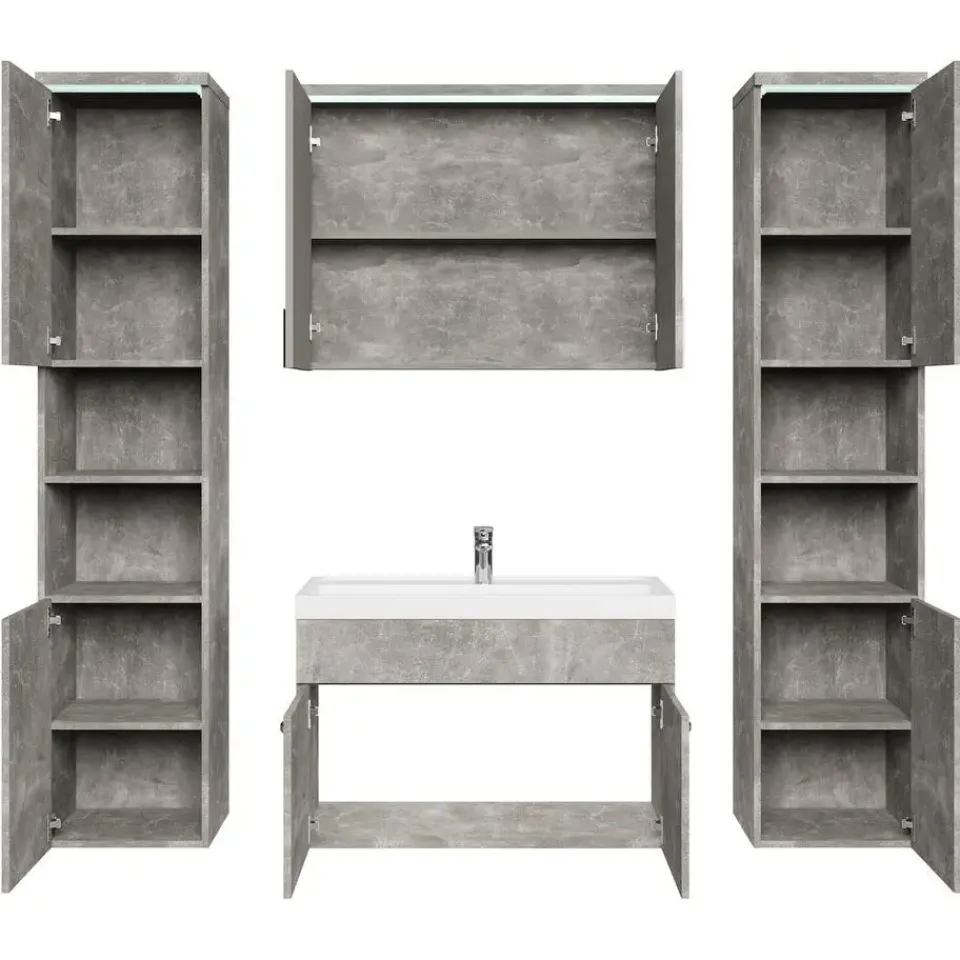 Badkamermeubel set Paso XL inclusief, wastafel en spiegelkast en twee kolomkasten.Vanwege zijn strakke afwerking is het meubel gemakkelijk schoon te maken.De set is uitgevoerd in beton grijs en is gemakkelijk te monteren. De spiegelkast en zijkasten zijn uitgevoerd met LED verlichting.