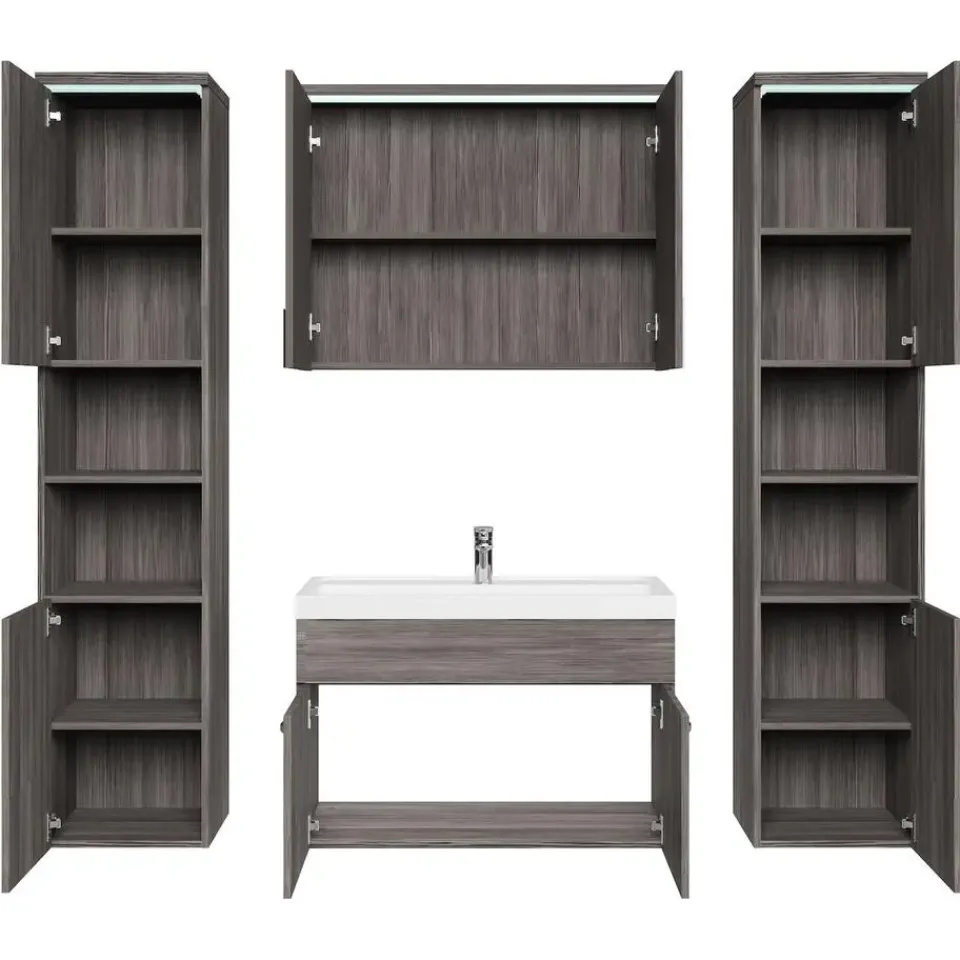 Badkamermeubel set Paso XL inclusief, wastafel en spiegelkast en twee kolomkasten.Vanwege zijn strakke afwerking is het meubel gemakkelijk schoon te maken.De set is uitgevoerd in grijs eiken en is gemakkelijk te monteren. De spiegelkast en zijkasten zijn uitgevoerd met LED verlichting.