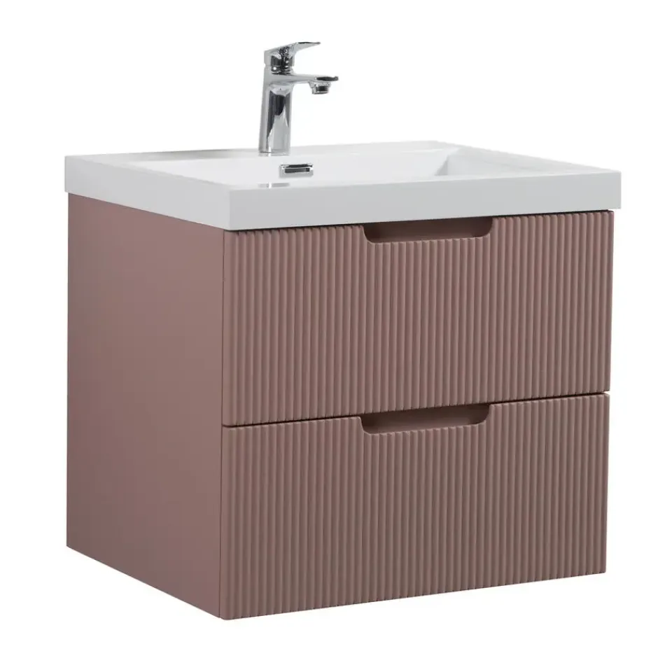 Badkamermeubel set Thermis inclusief onderkast en wastafel.De onderkast is uitgevoerd met twee lades met soft close sluiting.De wastafel is gemaakt van kunstmarmer, de wastafelkast is uitgevoerd in het roze.