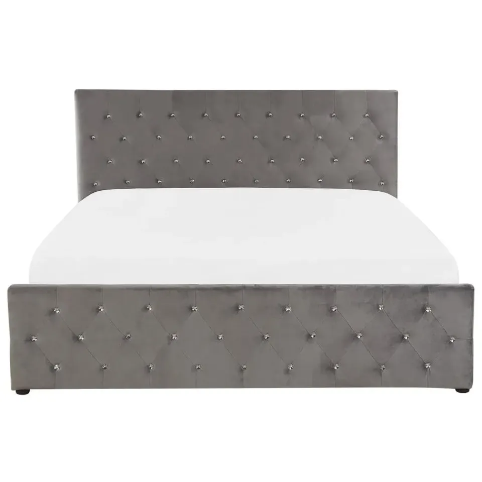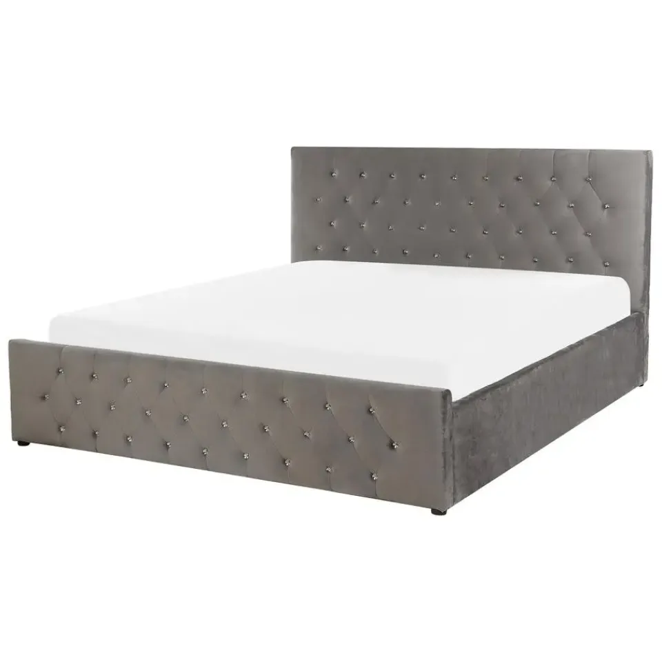 Belangrijkste eigenschappen: Schokabsorberende bedbodem voor goede ondersteuning, Stevig, duurzaam geïntegreerd frame, Stijlvolle Chesterfield-look, Versiert met knoopdetails, Stabiele en duurzame constructie, Zijdezacht, fluwelen stof, Functionele, grote opbergruimte