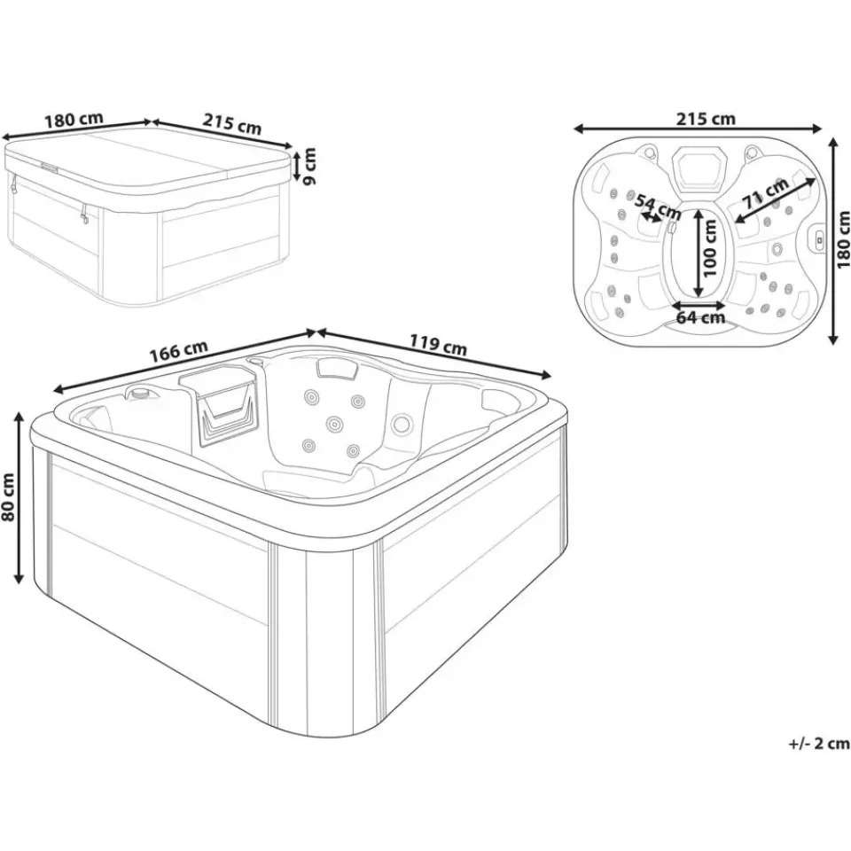 Belangrijkste eigenschappen: Onderwater led-verlichting, Met waterjets, Praktische deksel om de hot tub af te dekken, Ozon-sterilisator, CE-certificaat, Geschikt voor gebruik het hele jaar door