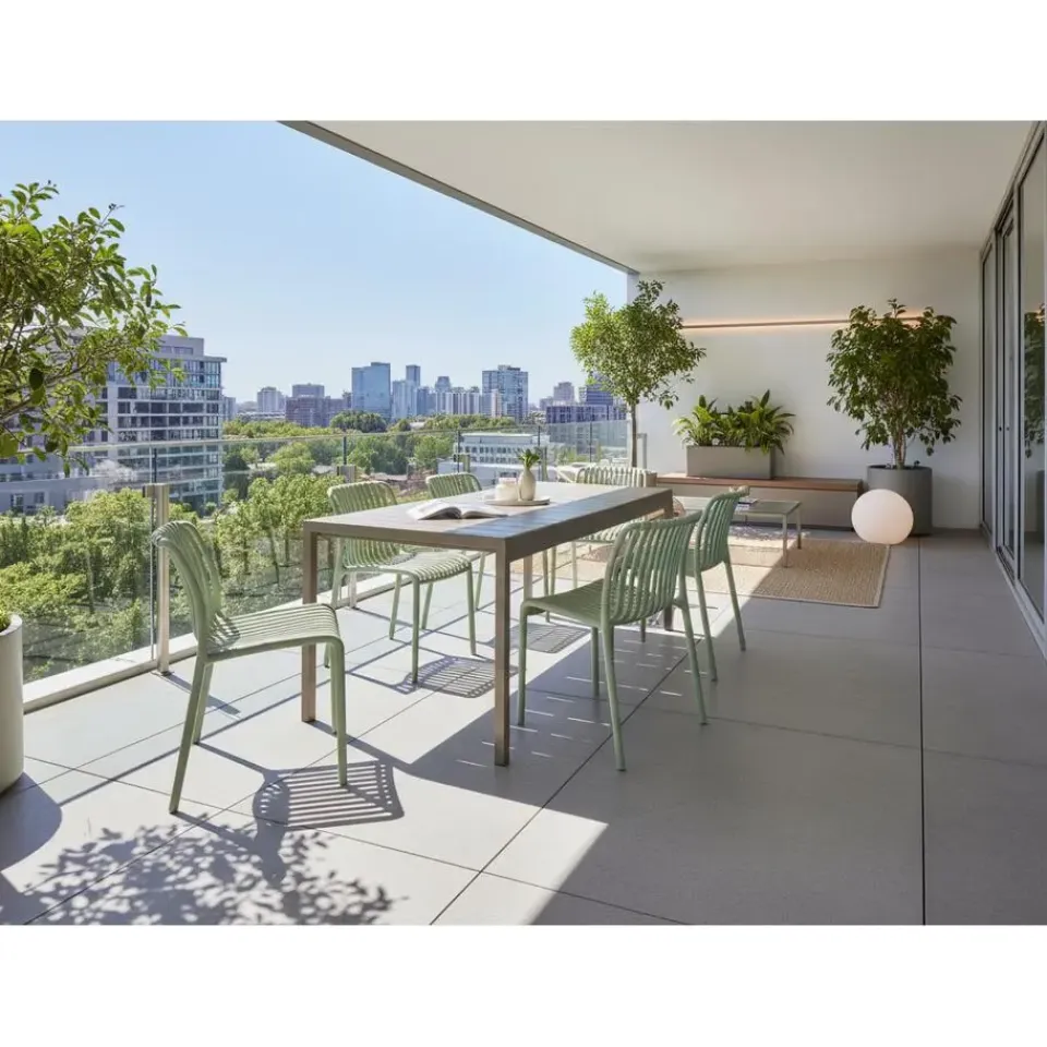 Belangrijkste eigenschappen: Modern terras- en tuinmeubilair, Weersbestendig en vuilafstotend materiaal, Roestvrijstalen frame, UV-bestendigheidsklasse, Uitzonderlijk onderhoudsvriendelijk, Beschermdoppen voor oppervlaktebescherming