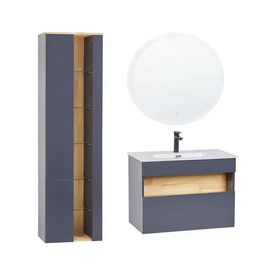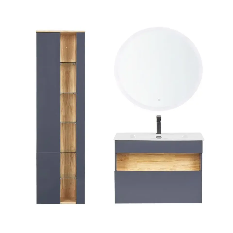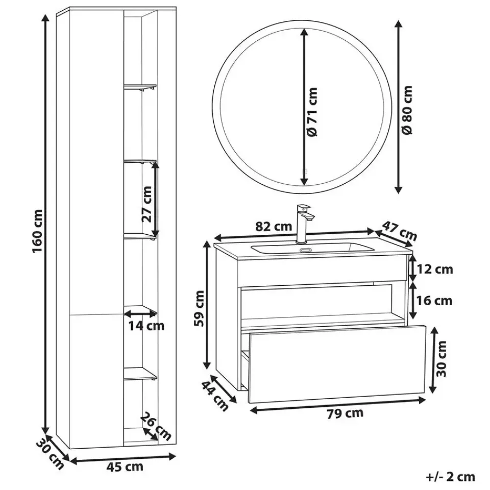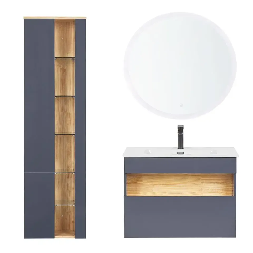 Aanbod omvat: 1 x wastafelkast, 1 x Spiegel, 1 x Wandplank, 1 x Wastafel, Niet inbegrepen: Kranen