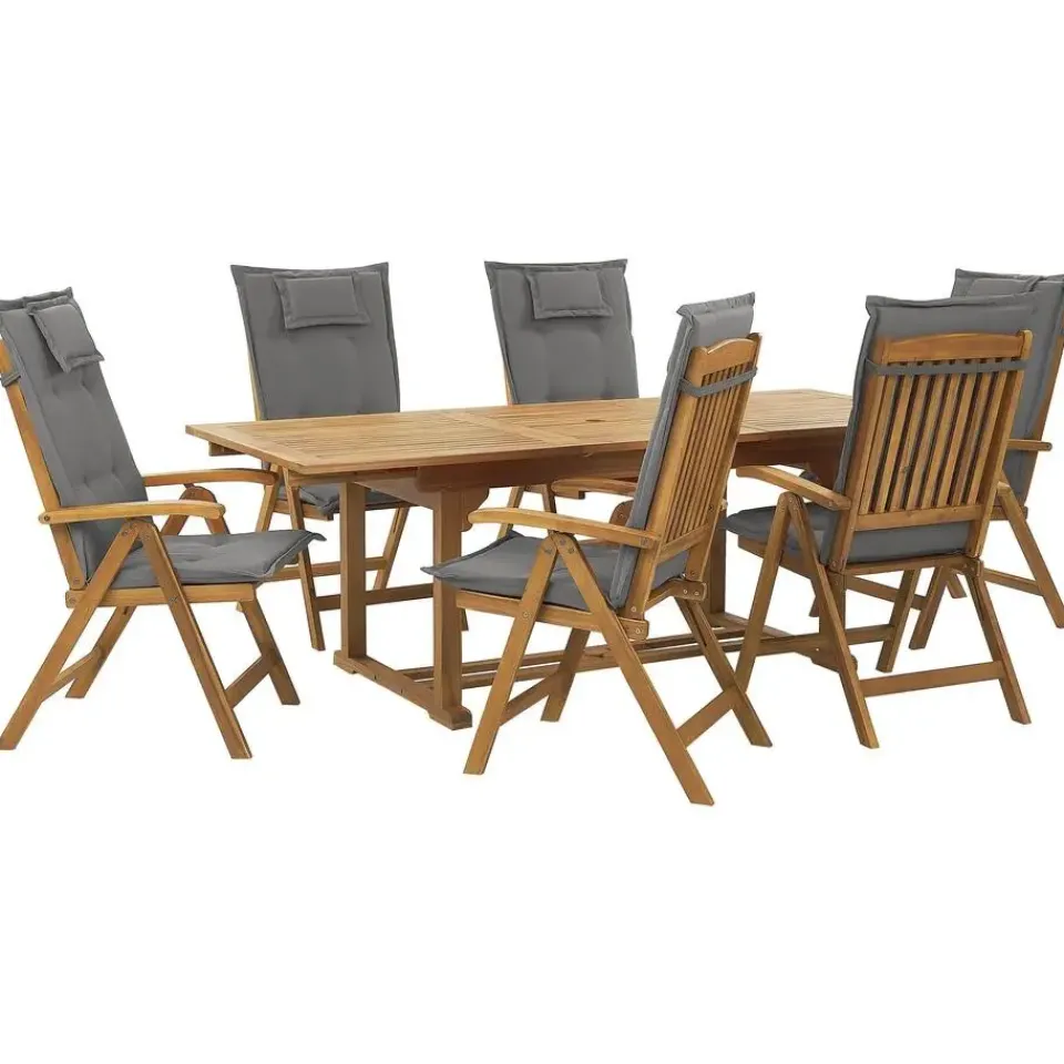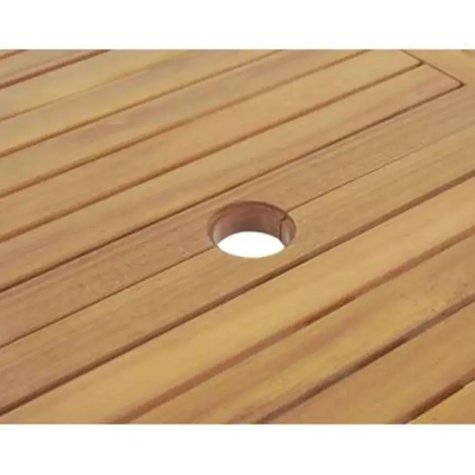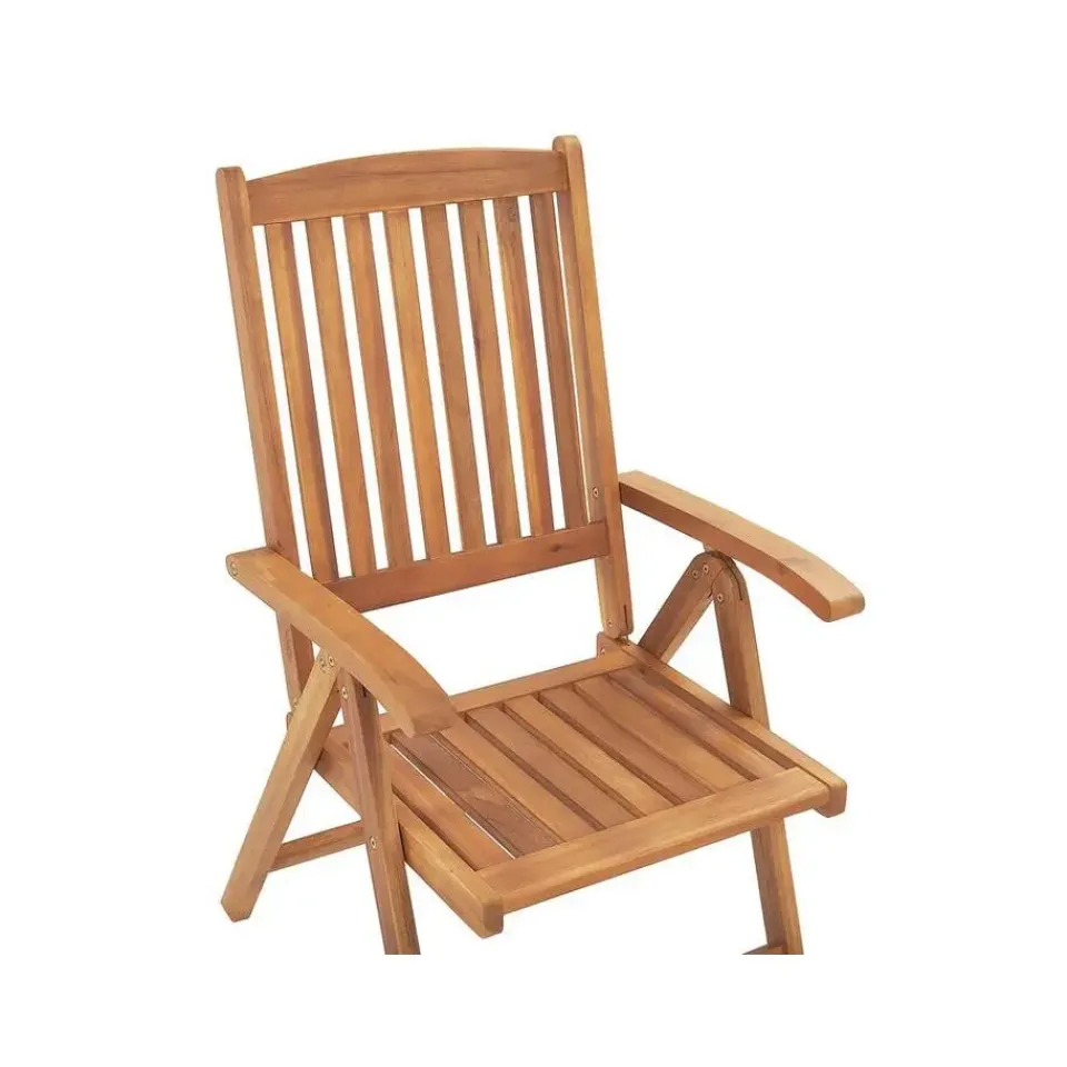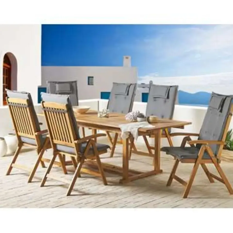 Belangrijkste eigenschappen: Rugleuning verstelbaar in 6 posities, Tafelblad met gat voor parasol, Praktische touwtjes voor gemakkelijke bevestiging aan de zitting, Perfect gevormde armleuningen, Gemaakt van natuurlijk resistente materialen, UV-bestendigheidsklasse 5 (ISO 105-B02), Ruimtebesparend inklapbaar