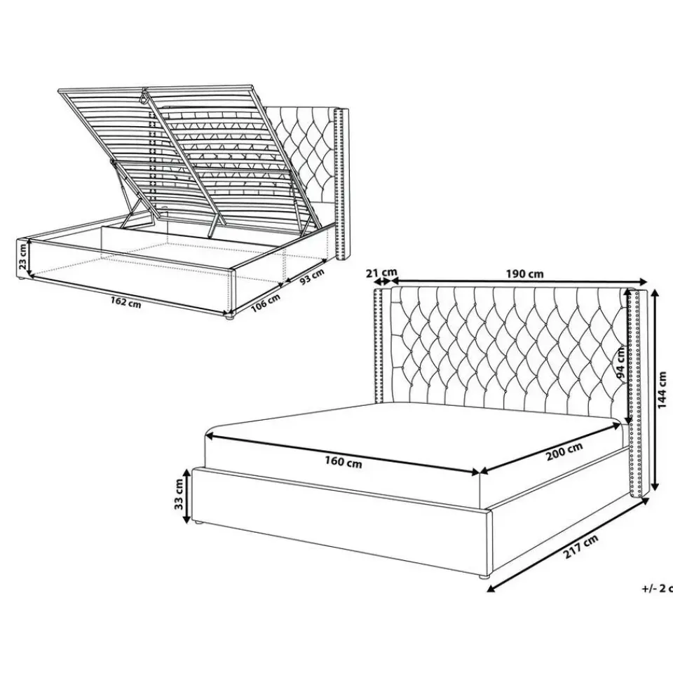 Belangrijkste eigenschappen: Schokabsorberende bedbodem voor goede ondersteuning, Elegant accentstuk, Stijlvolle klinknageldecoratie aan de rand, Perfecte combinatie van kleuren en materialen, Robuuste constructie van het frame, Rondom bekleed en dus vrij op te stellen, Voldoende opslagruimte
