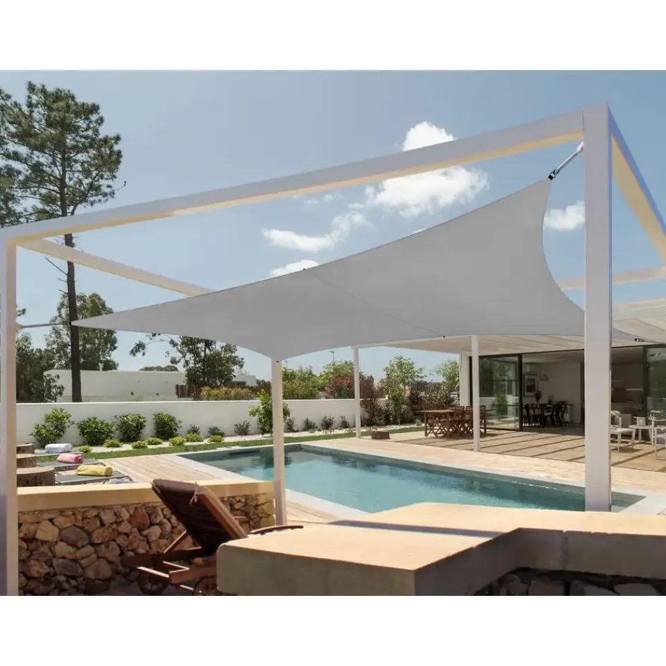 Extra informatie: Om te voorkomen dat het water zich op het schaduwdoek verzamelt, moet het onder een hoek (en niet in een rechte lijn) worden gemonteerd.
