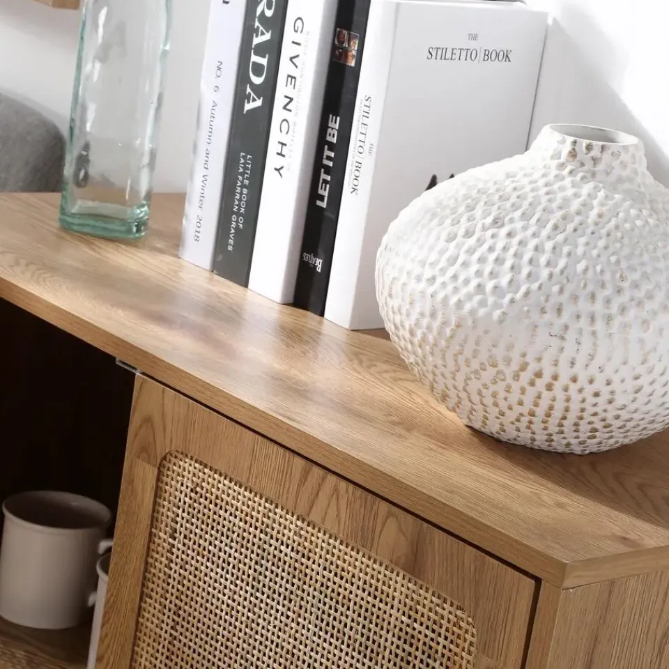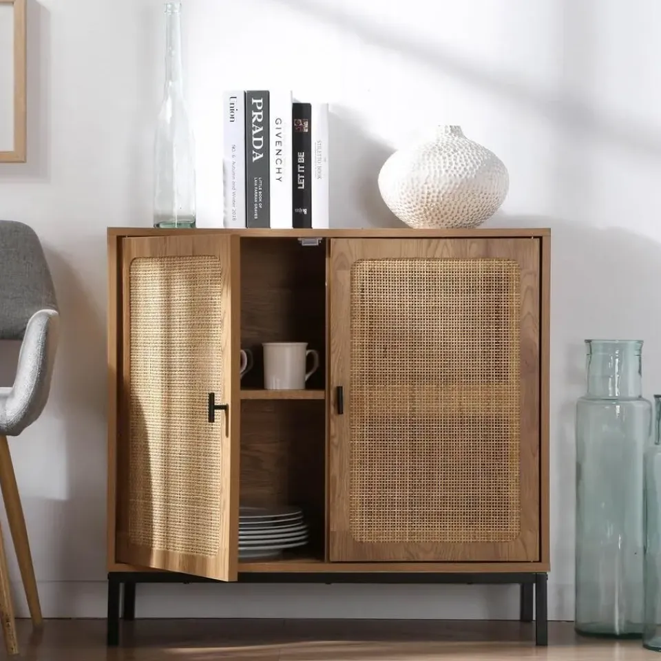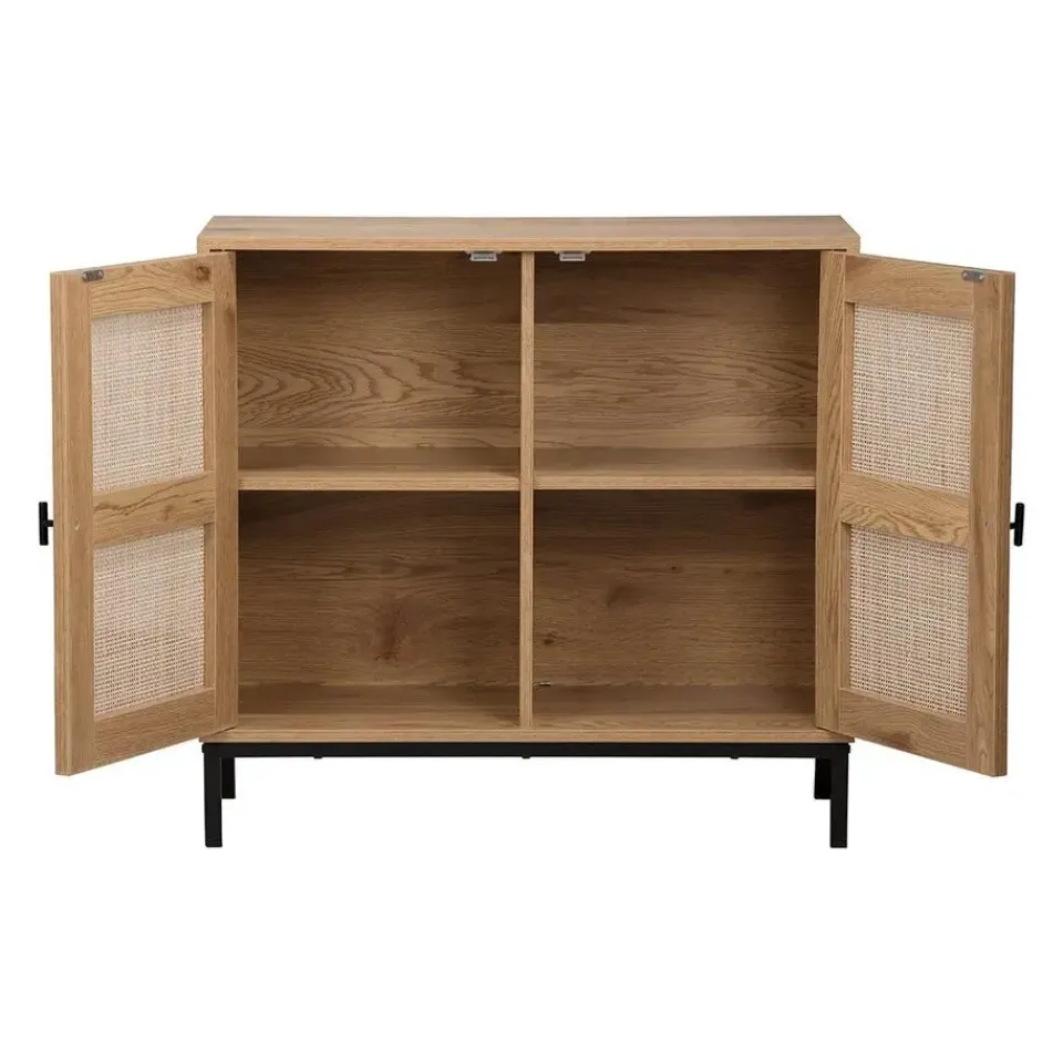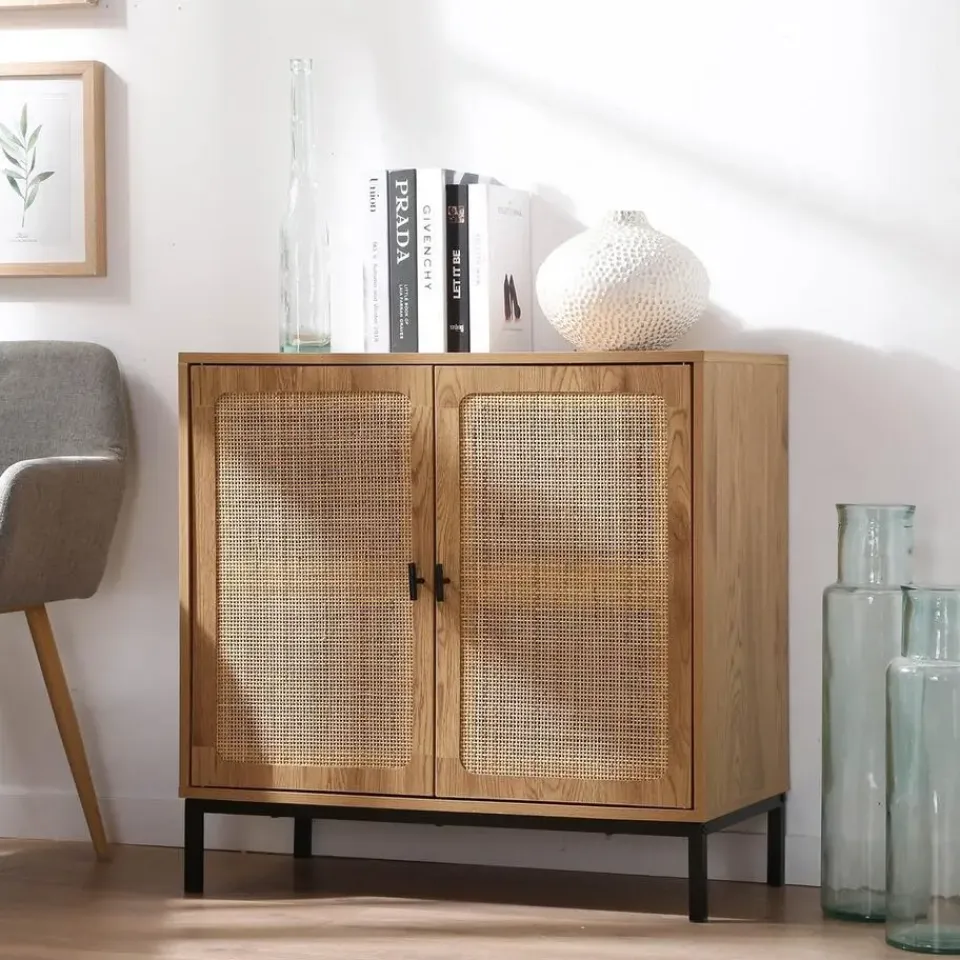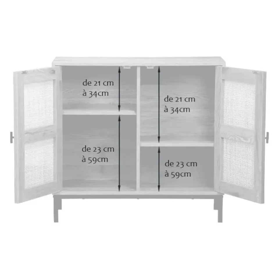 Productkenmerken: Buffetkast met 2 deuren. Structuur van spaanplaat. Voorkanten van natuurlijk rotan. Zwarte metalen poten. 1 in hoogte verstelbare plank achter de deuren. De deuren kunnen in beide richtingen worden gemonteerd. Productafmetingen: Lengte 80 cm x breedte 35 cm x hoogte 75 cm – Nettogewicht: 19 kg. Afmetingen van het pakket: Enkel pakket: Lengte 86,5 cm x Hoogte 18 cm x Breedte 44,5 cm. Brutogewicht: 20 kg.