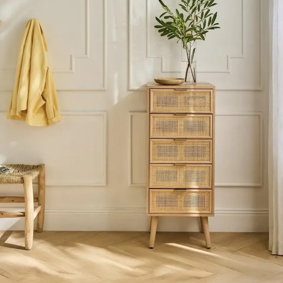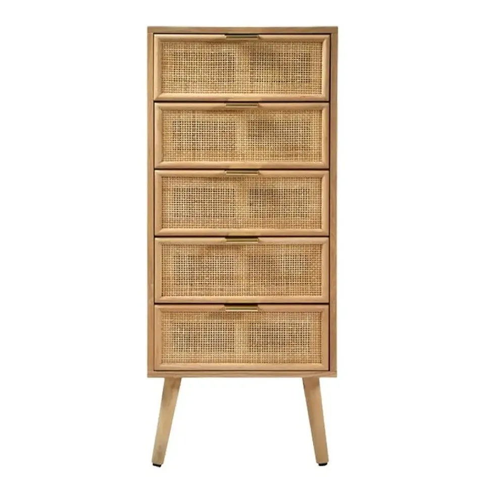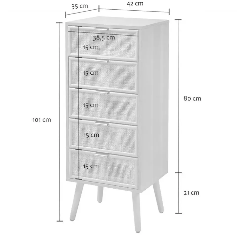 Ontdek onze ladekast met 5 lades met een natuurlijke uitstraling dankzij de natuurlijke rotan voorkant en massief grenen poten. Breng praktische en esthetische opslag in uw interieur. Dankzij de compacte afmetingen kan hij gemakkelijk in kleine ruimtes worden geplaatst om uw huis te optimaliseren!Producteigenschappen:Massief grenen poten, natuurlijke rotan lades voorkant, MDF.5 lades.Productafmetingen:Lengte 36,5 cm x Breedte 42 cm x Hoogte 100,5 cm – Nettogewicht: 20 kg.Afmetingen van het pakket:Pakket nr.1: Lengte 86 cm x Hoogte 20 cm x Diepte 41 cm – Brutogewicht: 21,5 kg.