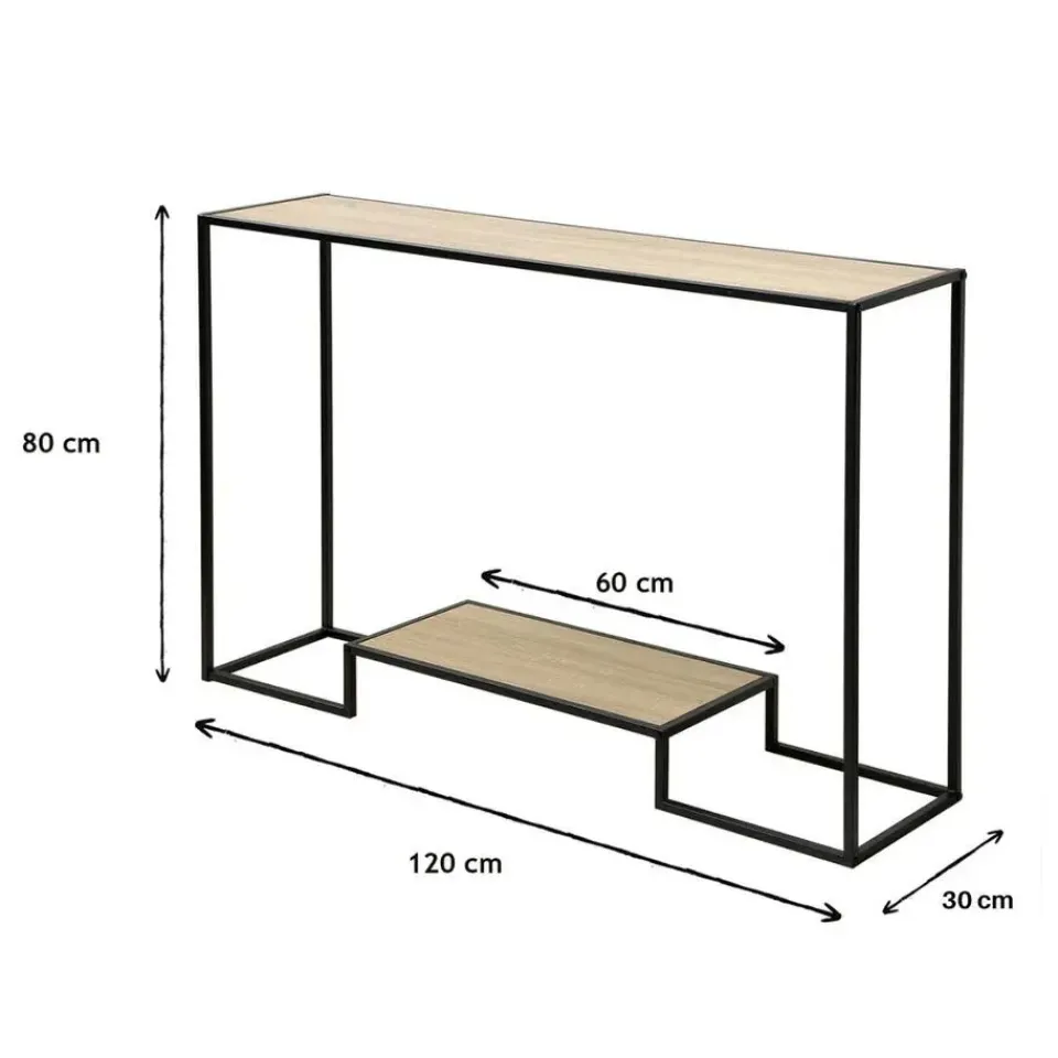 Ontdek onze moderne 2 laags consoletafel – eiken decor L120cm – het ideale meubelstuk om uw inkomhal, uw gang of uw woonkamer mee in te richten. Met zijn tijdloze industriële stijl en moderne design past deze console in elke omgeving en in elke kamer van het huis! Dit meubel is gemaakt van resistente houten panelen bedekt met een imitatie eiken afwerking. De structuur is gemaakt van mat zwart staal. De structuur is gemaakt van zwart mat staal, dus hij zal lang meegaan! De console heeft een grote hoofdplank voor het opbergen van uw spullen, uw post en uw decoraties. Het heeft ook een tweede lade om bijvoorbeeld een mand in te zetten! Dit meubelstuk komt bij u thuis in kitvorm met instructies en alle nodige schroeven en bouten, u hebt maar weinig tijd nodig om het op te zetten! Kenmerken van de kleerkast: Materialen: 12 mm resistente spaanplaat / Zwart mat stalen structuur. Afmetingen: B 120 x D 30 x H 80 cm . Gewicht : 8,2 Kg