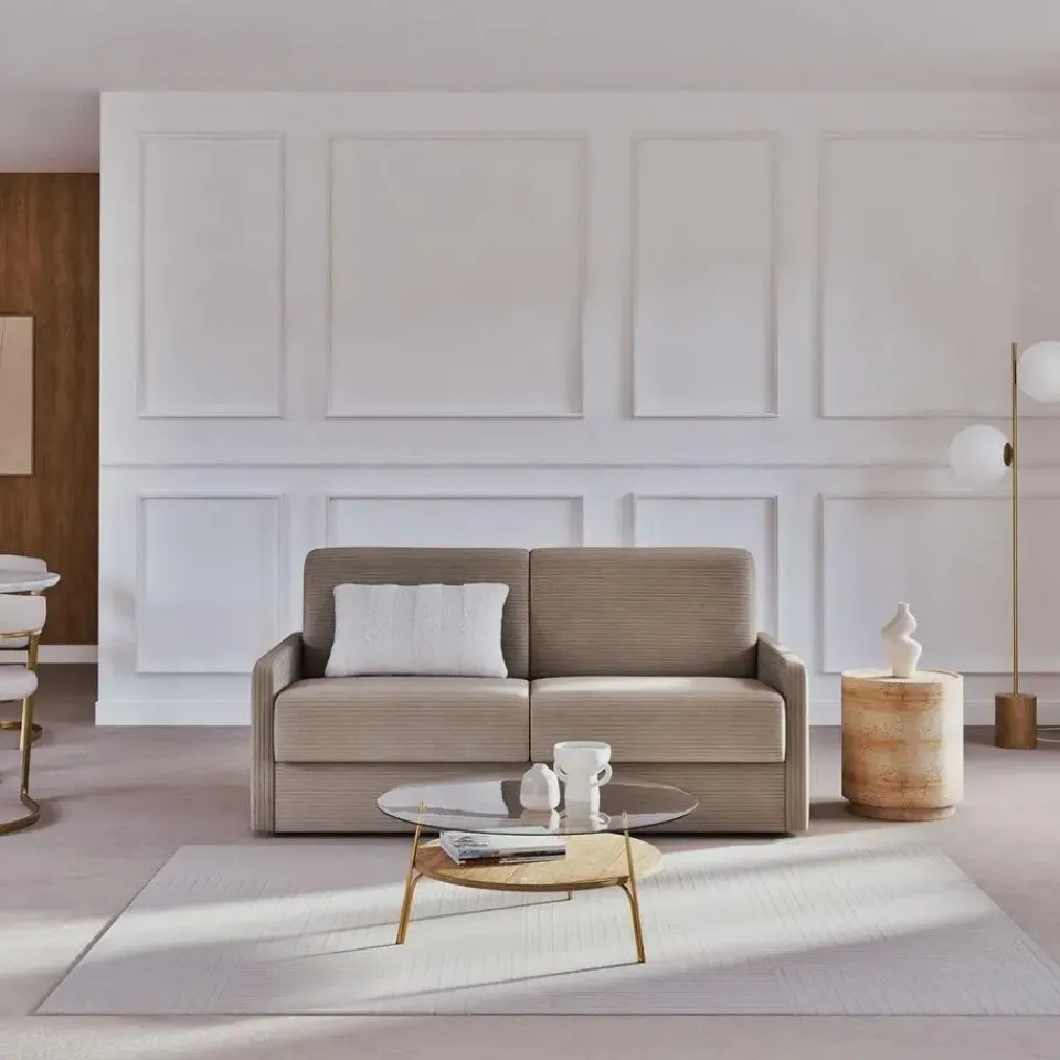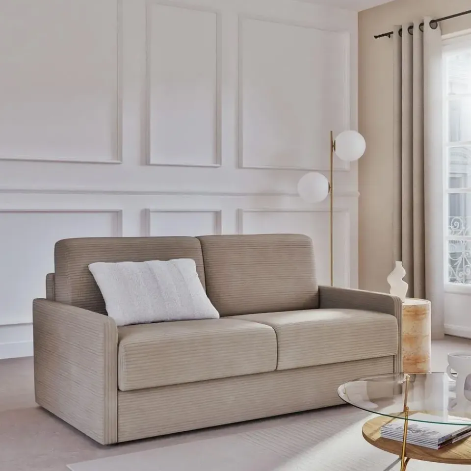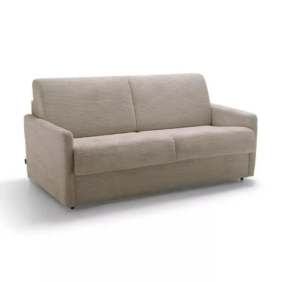 Productkenmerken: Omvormbare 3-zitsbank met fluwelen ribstof Lincoln 03 ivory. Snelle opening. Slaapplaats van 140×190 cm. Rugleuning met kussenopbergruimte. Verwijderbare armleuningen. Afneembare zittingen. VULLING: Polyurethaanschuim met verschillende dichtheden (zitkussendichtheid: 30 kg/m3, rugkussendichtheid: 18 kg/m3). BEDSYSTEEM: Dubbel opvouwbaar elektro-gelast bedframe met een matras van 14 cm hoogte in jacquard/stretch stof. Productafmetingen: Lengte 175 cm x breedte 100 cm x hoogte 87 cm – Nettogewicht: 90 kg. Pakketafmetingen: Pakket nr. 1: Lengte 162 cm x hoogte 89 cm x diepte 102 cm – Brutogewicht: 81 kg. Pakket nr. 2: Lengte 18 cm x hoogte 62 cm x diepte 102 cm – Brutogewicht: 11 kg. Totaal brutogewicht: 92 kg.